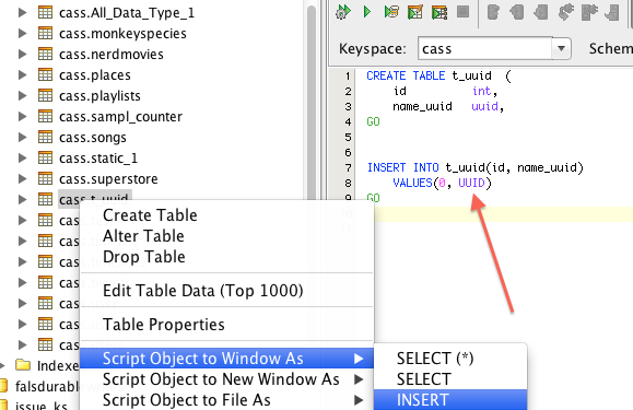 2. Right click on the newly created table and Select option Script to Window-> Insert. A string UUID is displayed instead of a real UUID.