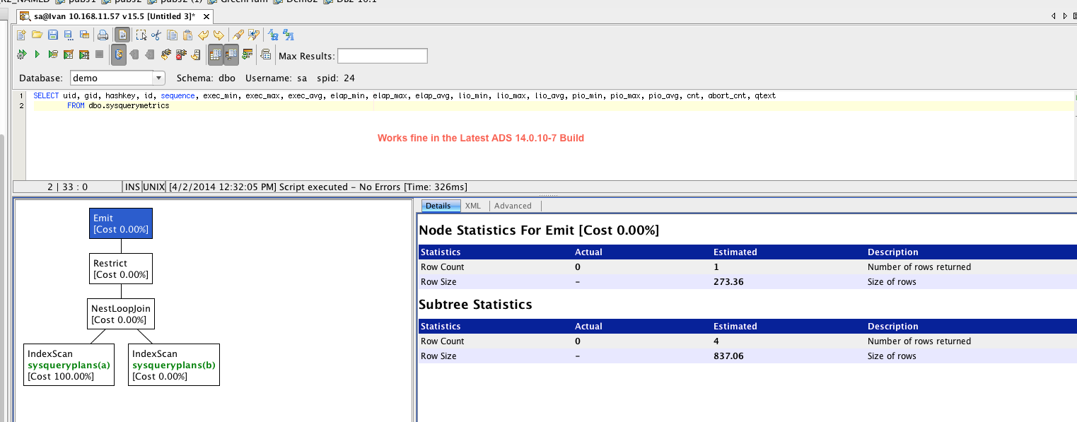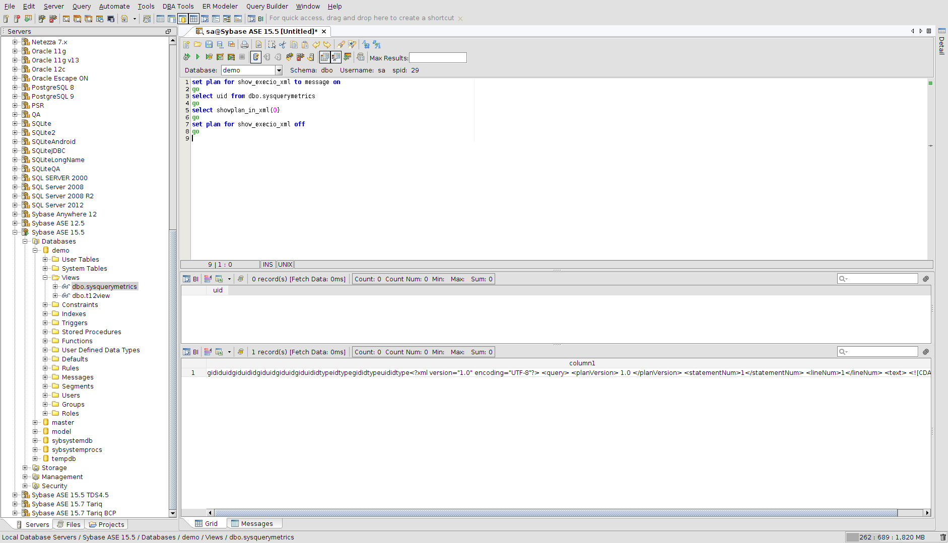 set plan for show_execio_xml to message on go select uid from dbo.sysquerymetrics go select showplan_in_xml(0) go set plan for show_execio_xml off go