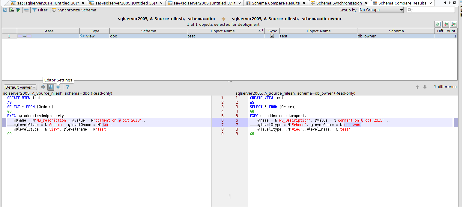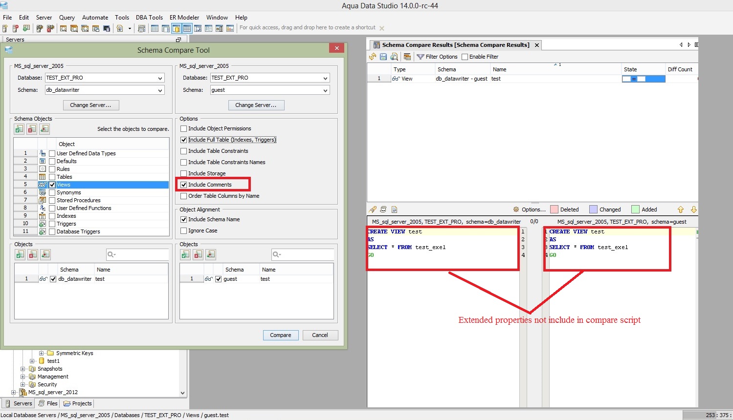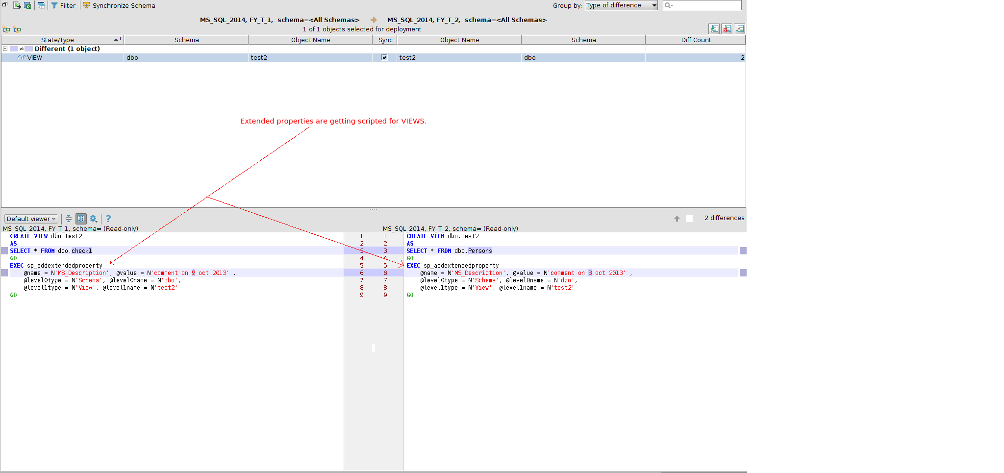 Extended properties are MS SQL Servers way of commenting on database objects. In ADS, we have added support to scripting extended properties for schema compare as well as schema sync in 6365 and 6610. With these implementations user will be able to compare the VIEWS with extended properties applied on them.Also extended properties can be synchronized if applied on any object in schema synchronization. These changes can be verified on ADS 18.0.0-devi-243. Please refer the attachment.