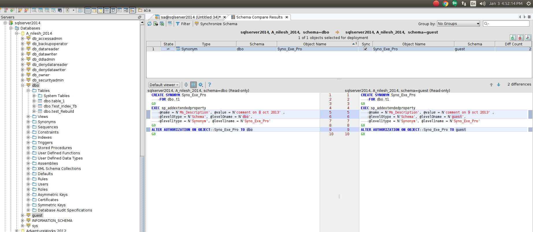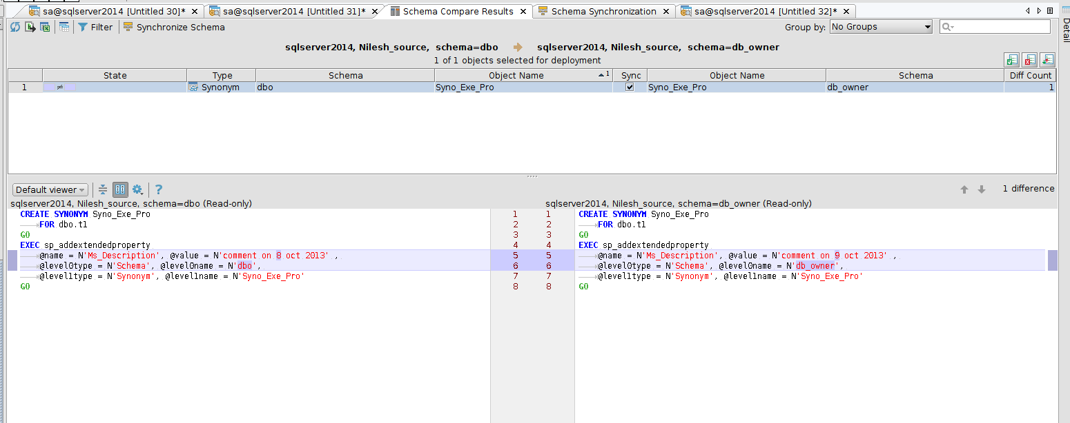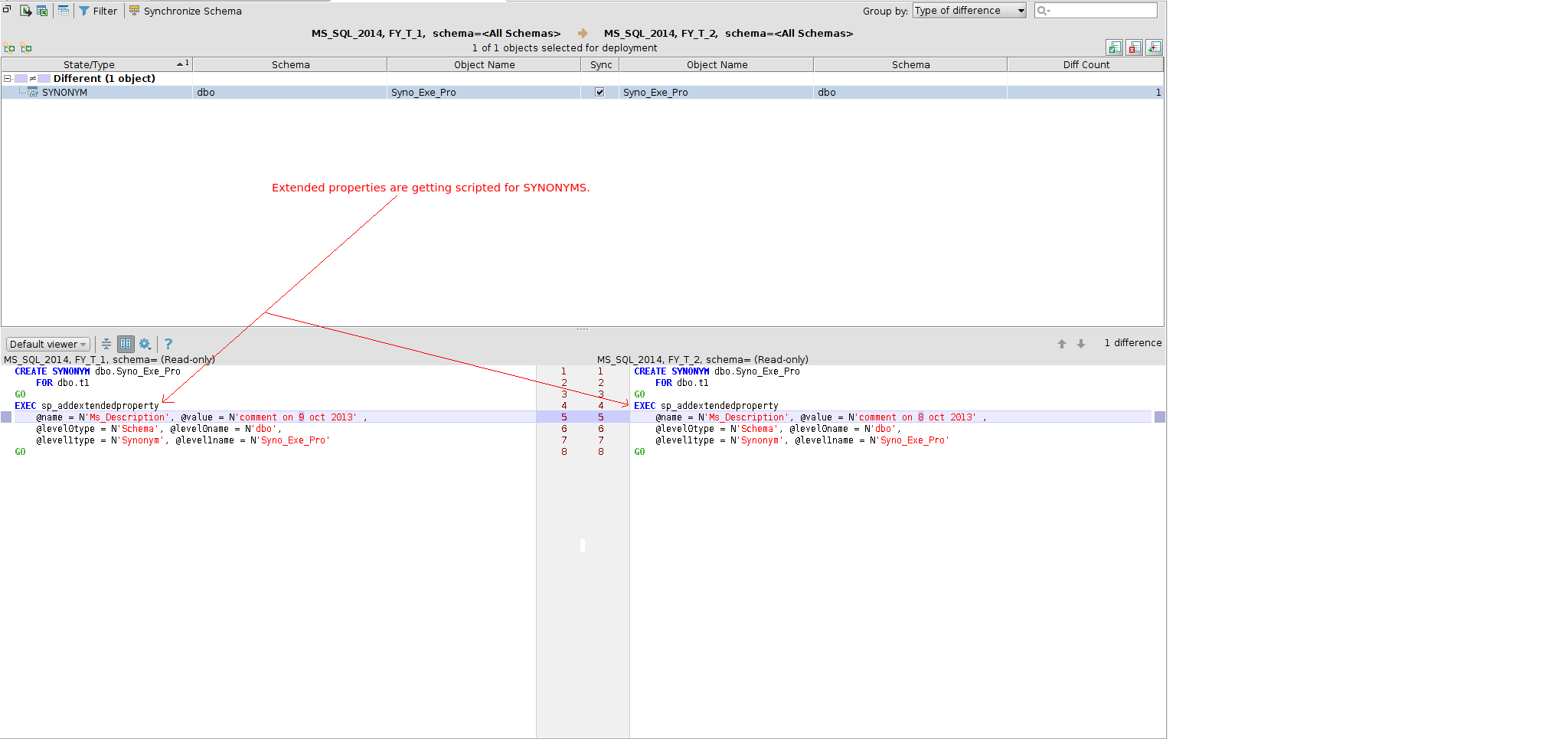 Extended properties are MS SQL Servers way of commenting on database objects. In ADS, we have added support to scripting extended properties for schema compare as well as schema sync in 6365 and 6610. With these implementations user can will be able to compare the SYNONYMS with extended properties applied on them.Also extended properties can be synchronized if applied on any object in schema synchronization. These changes can be verified on ADS 18.0.0-devi-243. Please refer the attachment.