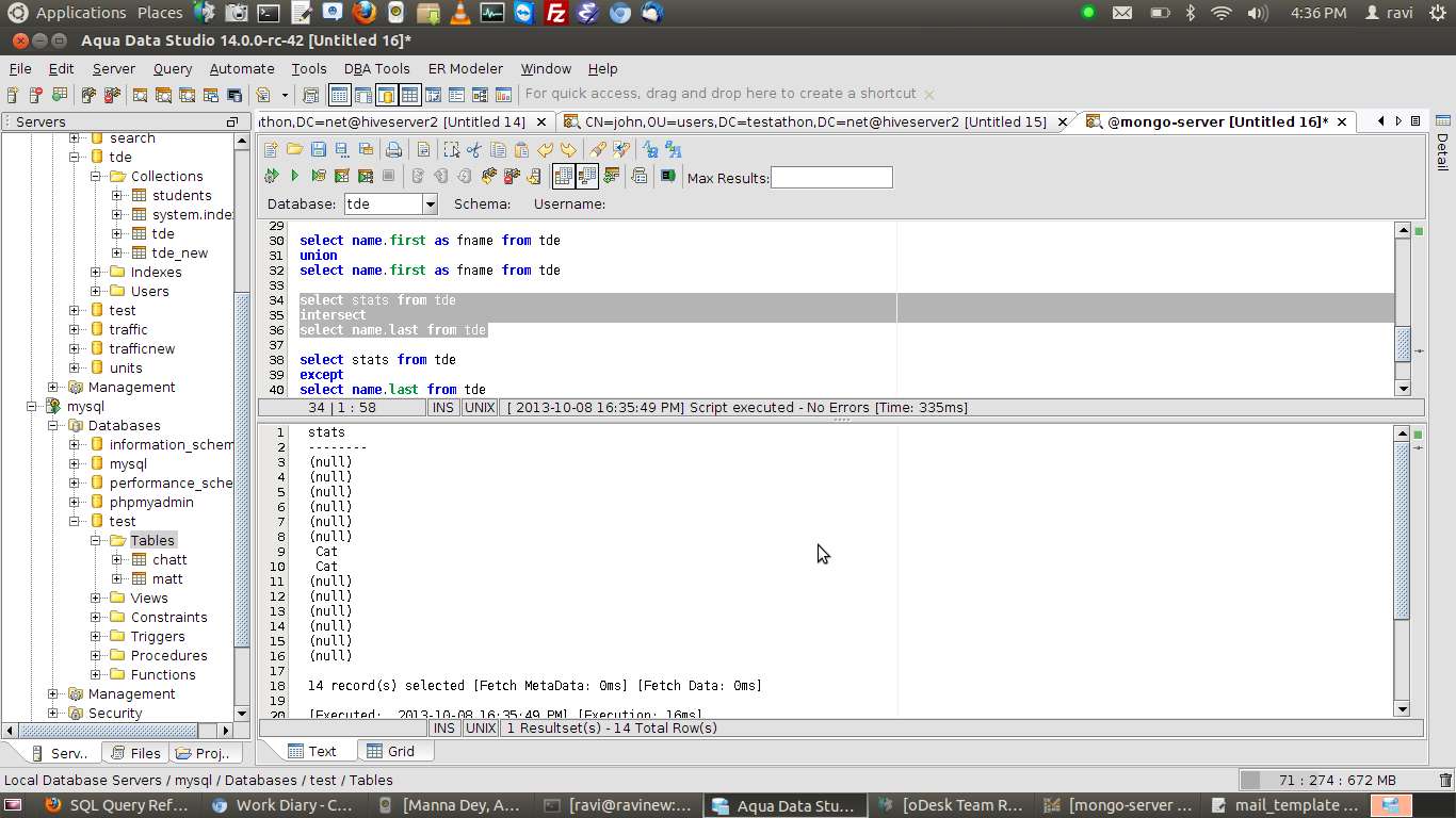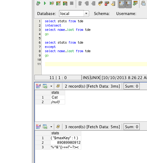 ADS returns multiple occurrences of same values viz (null) and Cat in this particular case. (Pls refer to attached mongoSQL_intersect.png).