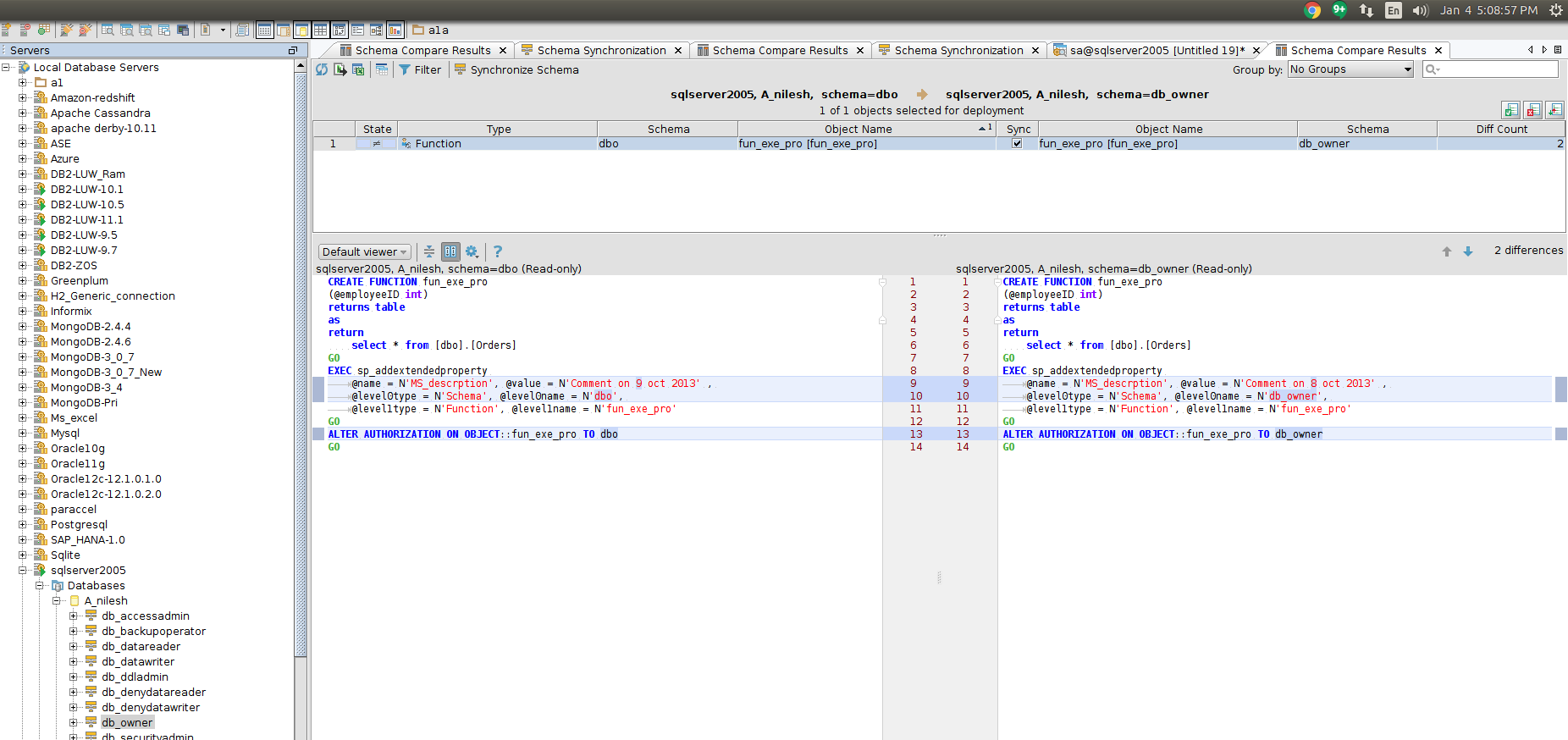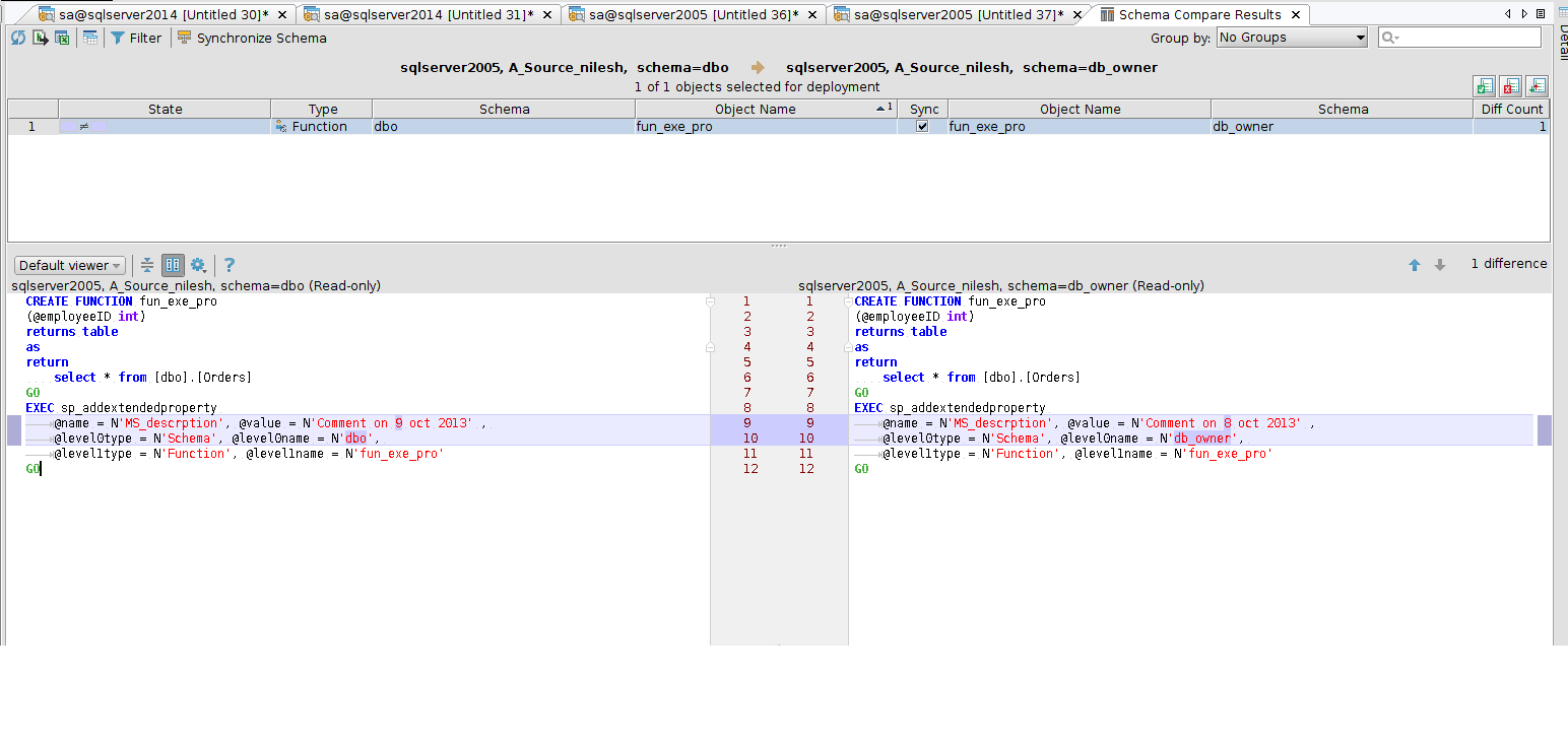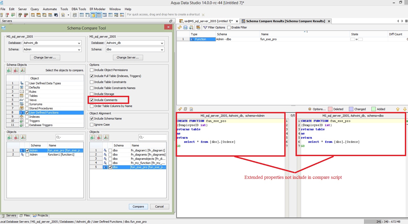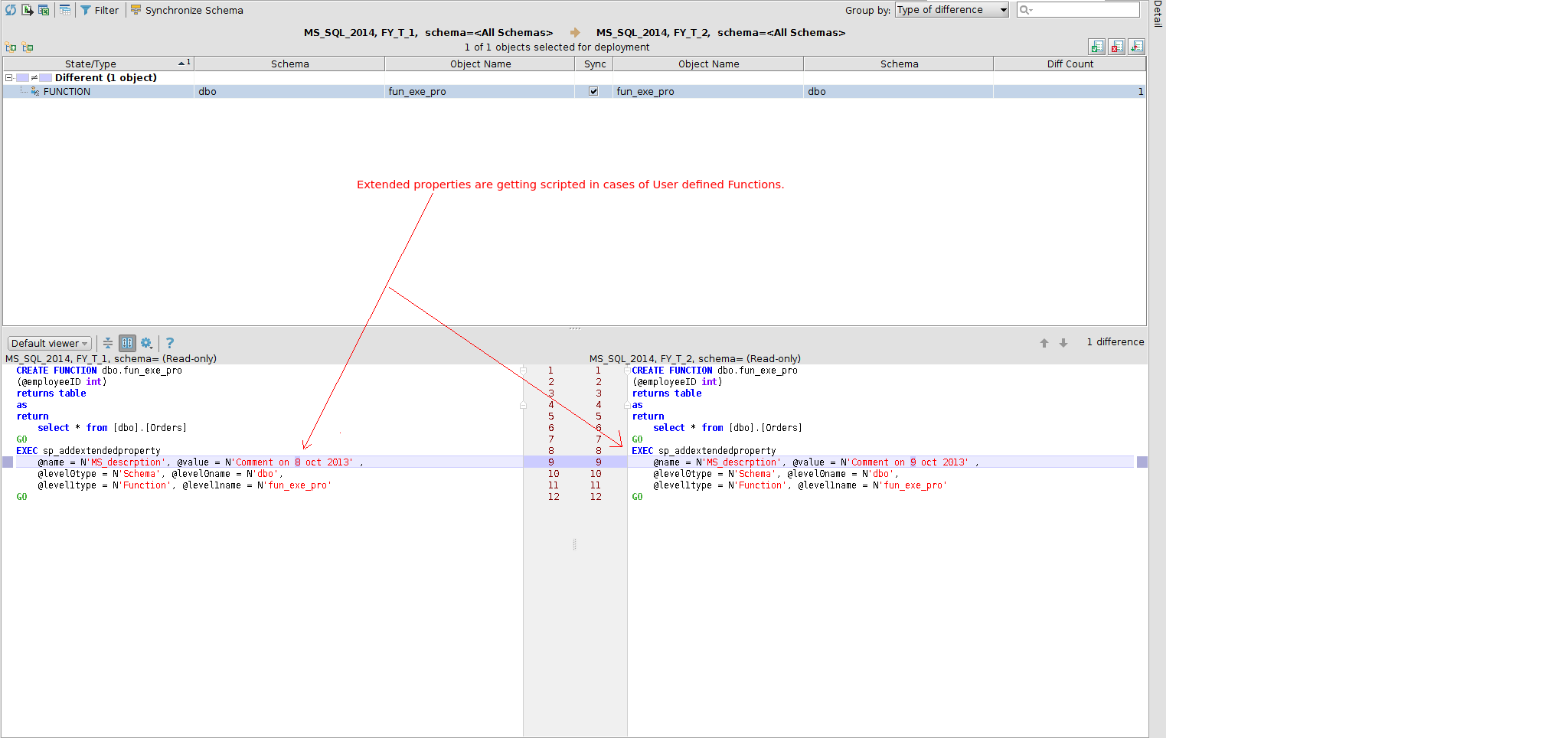 Extended properties are MS SQL Servers way of commenting on database objects. In ADS, we have added support to scripting extended properties for schema compare as well as schema sync in 6365 and 6610. With these implementations user will be able to compare the functions with extended properties applied on them.Also extended properties can be synchronized if applied on any object in schema synchronization. These changes can be verified on ADS 18.0.0-devi-243. Please refer the attachment.