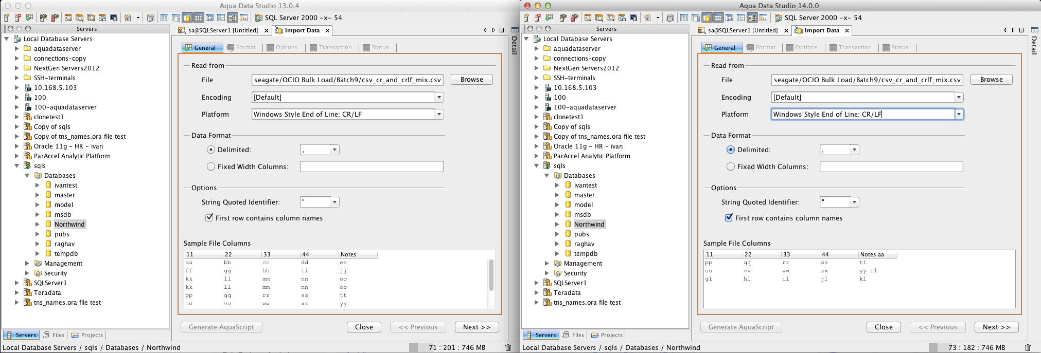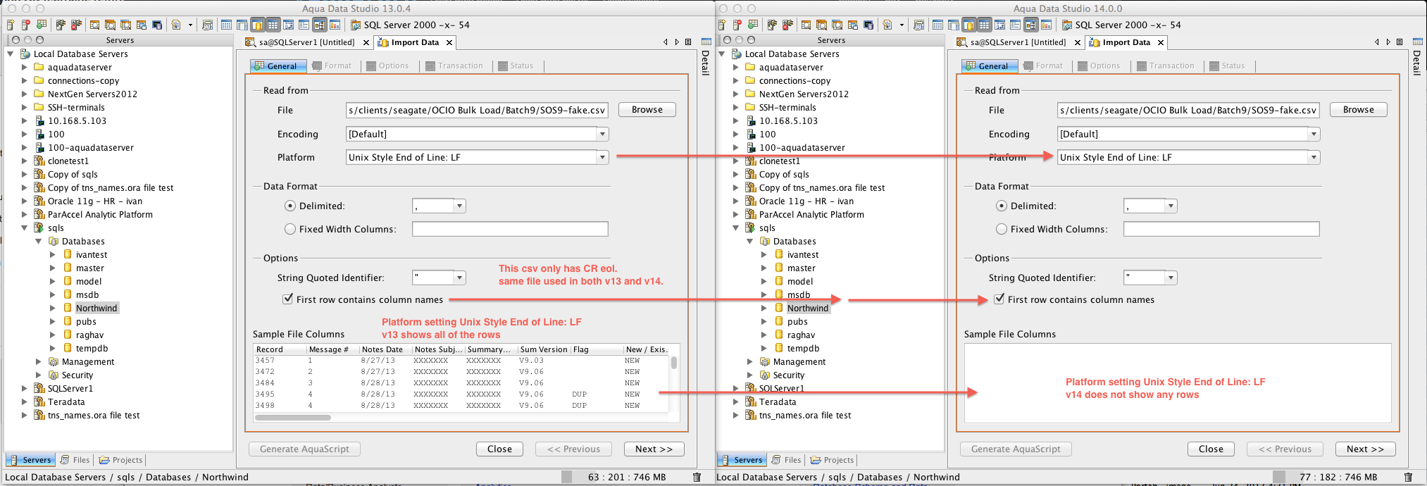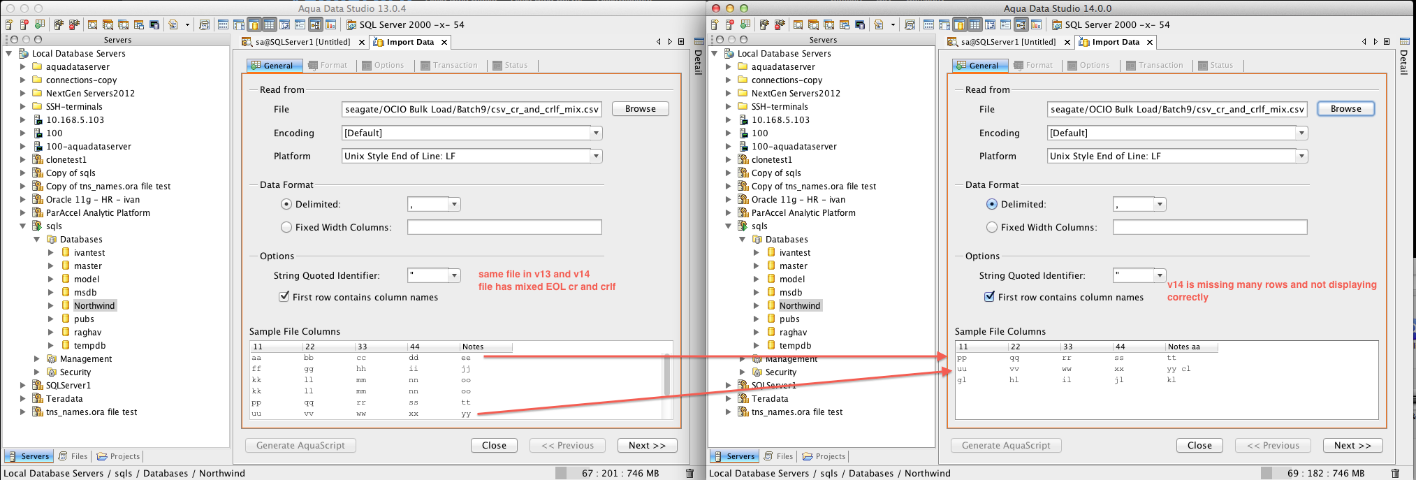 a cr only file side by side of v13 and v14 - unix style eol setting