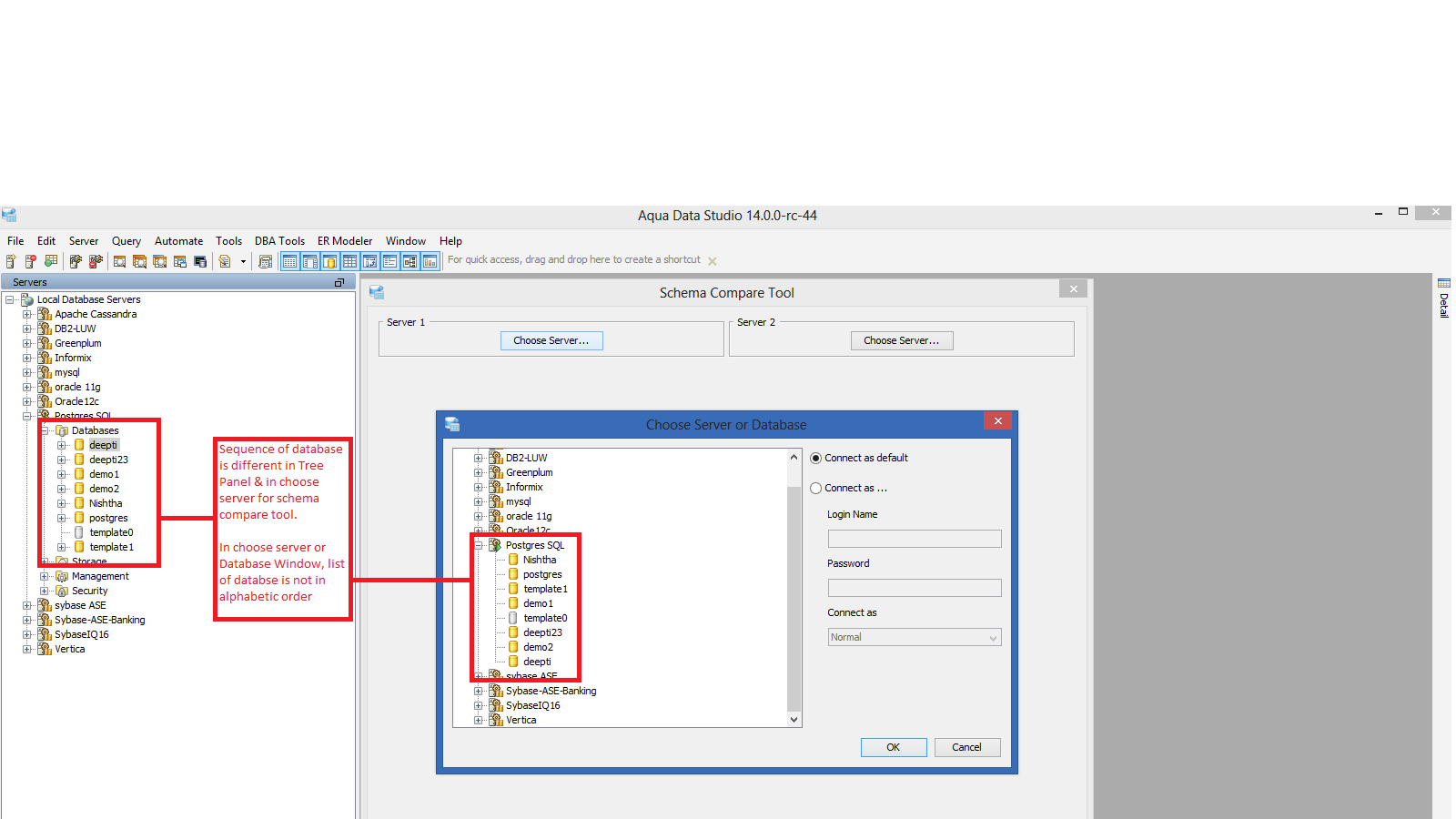 4)Order of Database in Tree Node and in Choose Server window is different.