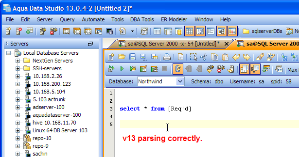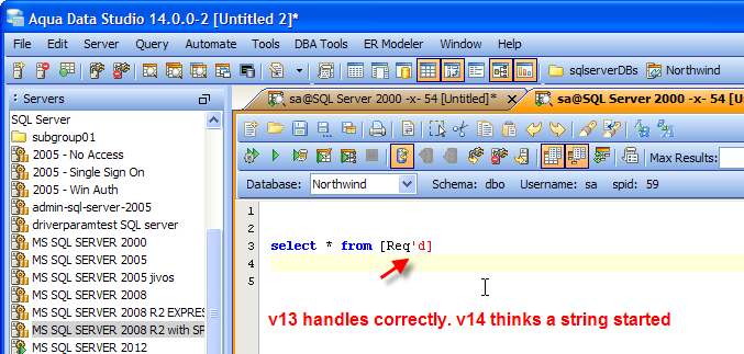 In v13 Aqua Data Studio would correctly notice that the single quote in this column was not the start of a string if it were inside square brackets [ ]. From the ' on the text would not turn red to indicate a string.