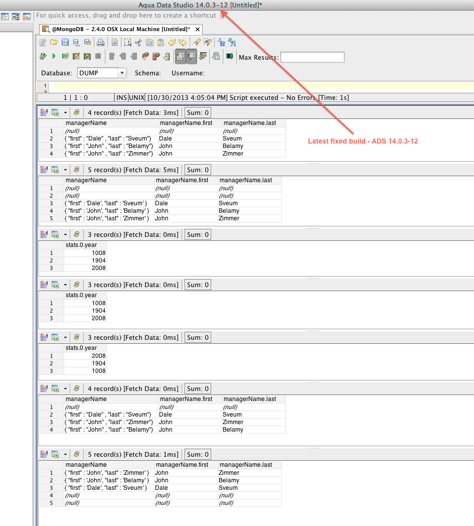 Tested in Aqua Data Studio 14.0.0-rc-44 Build #: 34314 on Ubuntu 12.04( Mongo DB 2.4.3) and Windows XP ( Mongo DB 2.0.9).