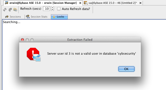 2. Connect to Sybase ASE 15 at 10.168.11.46:5000 with user named erwin and standard password and open Session Manafer and go to the Locks Tab