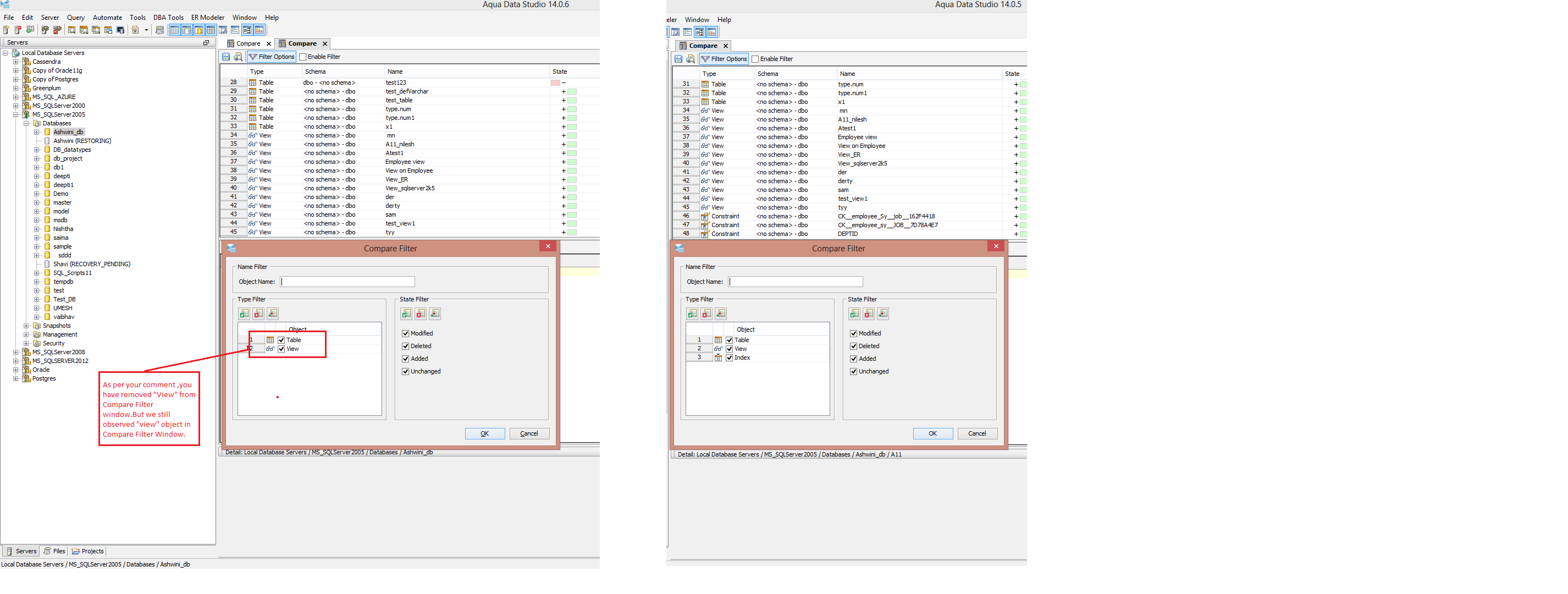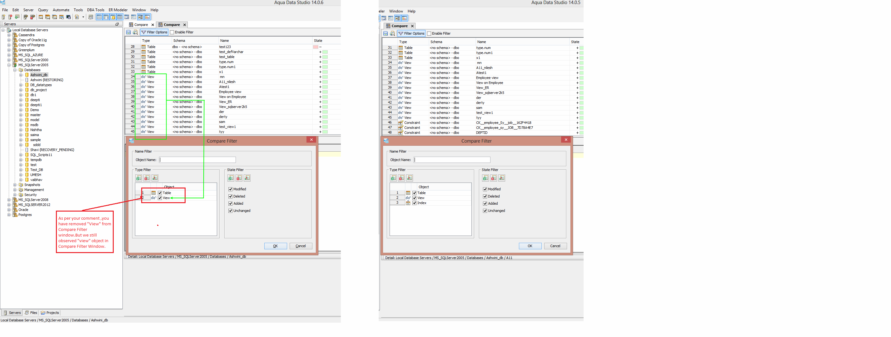 For example, referring to the attached screenshot, since the comparison results contain Table and Index, the Compare Filter dialog shows Table and Index only and View is not included in the Type Filter list.
