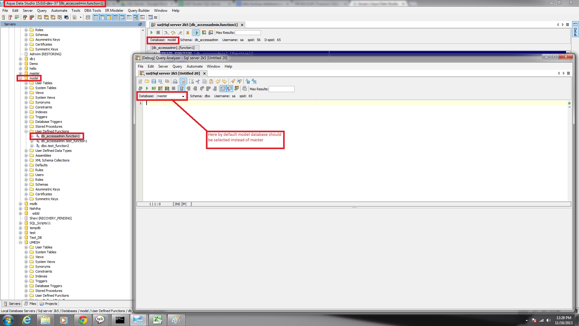Query analyzer window opens with master database selected in database dropdown list whereas current database i.e model database should be seen in database dropdown list