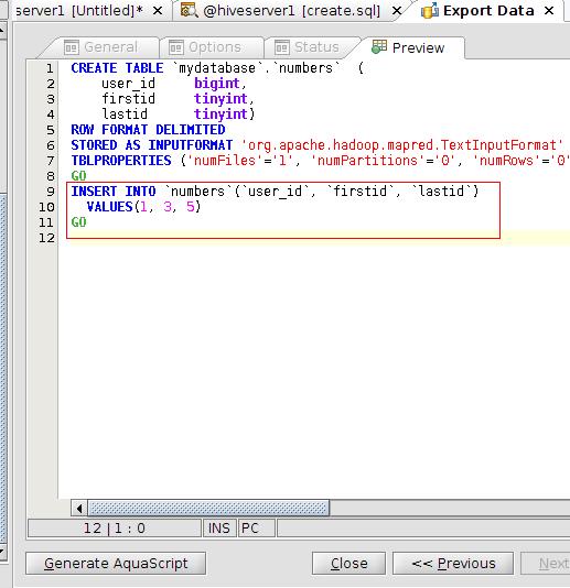 But despite this it produces INSERT... VALUES for tables with data which is wrong for HIVE( see attached screenshot)