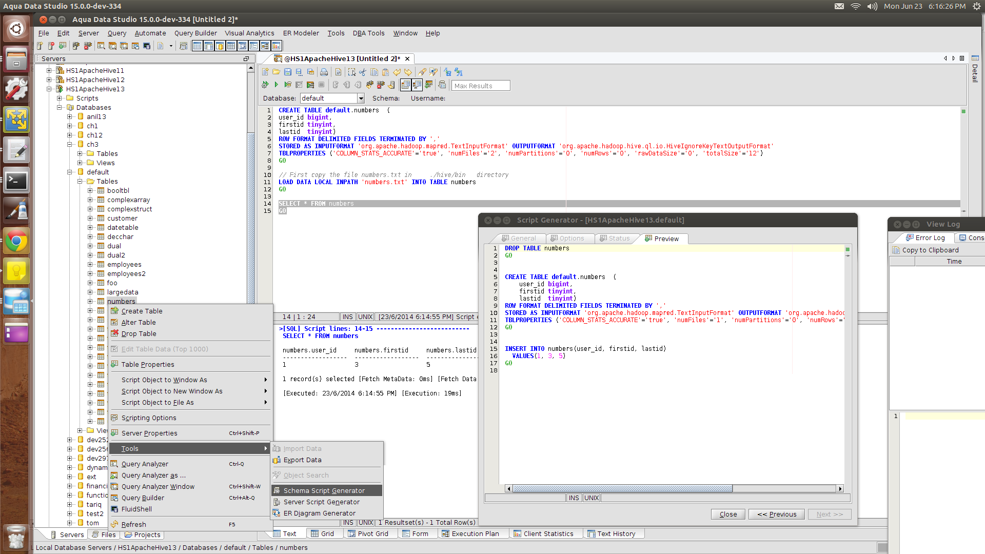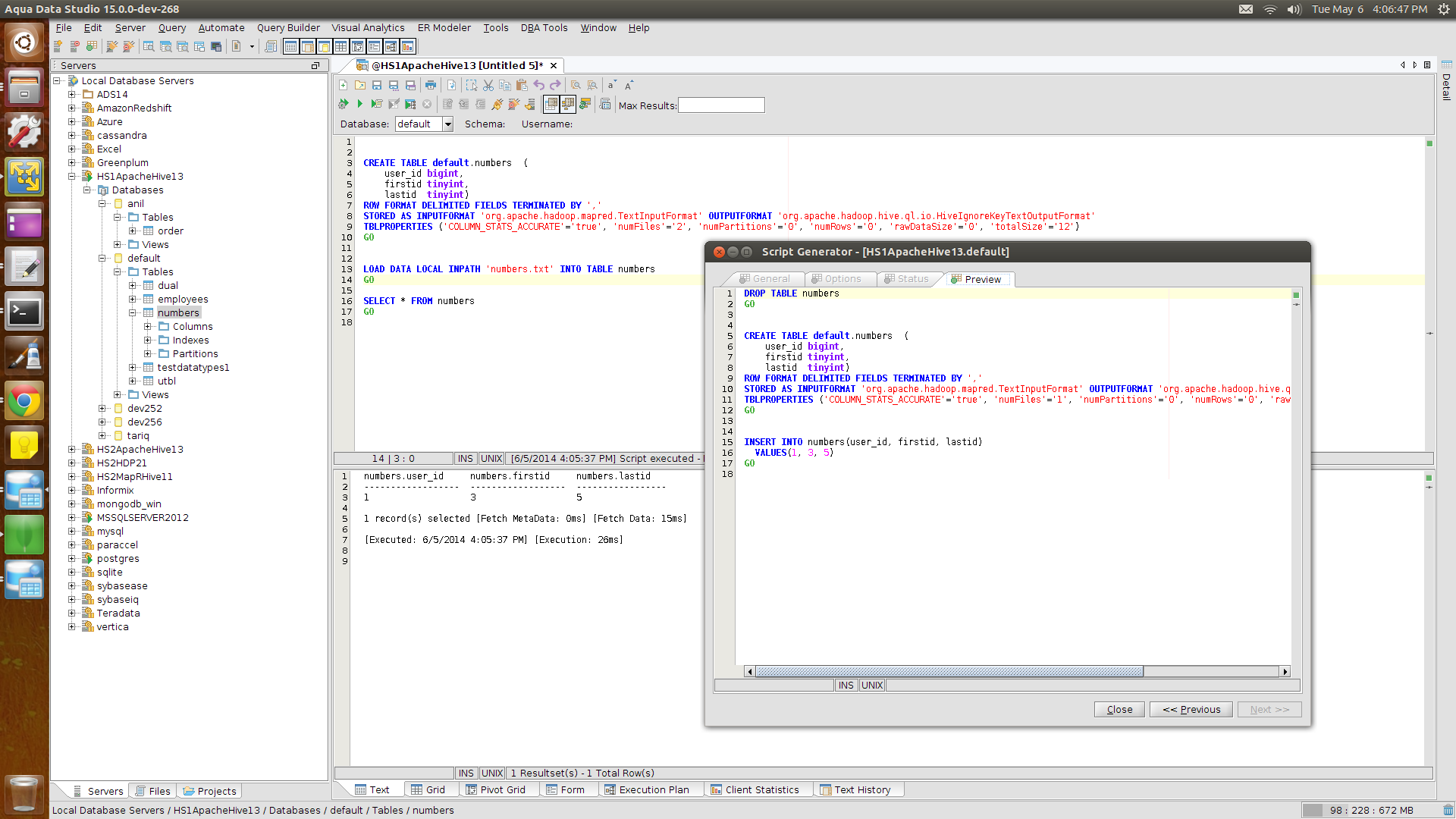 Tested in Aqua Data Studio 14.0.3-14 Build #: 34647 on Ubuntu 12.04( Hive 0.12.0( localhost,embeded mode), Hadoop 0.23.9)