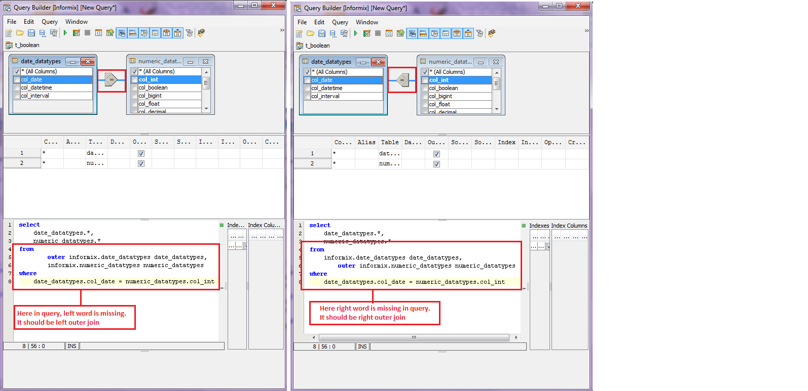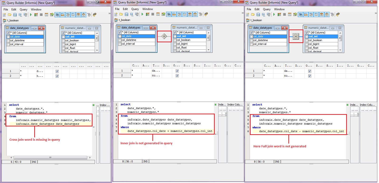 Issue : Query builder does not generate SQL joins for Informix database.