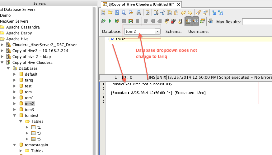 4. You can see that the command is executed successfully, but the database context in the drop down does not change
