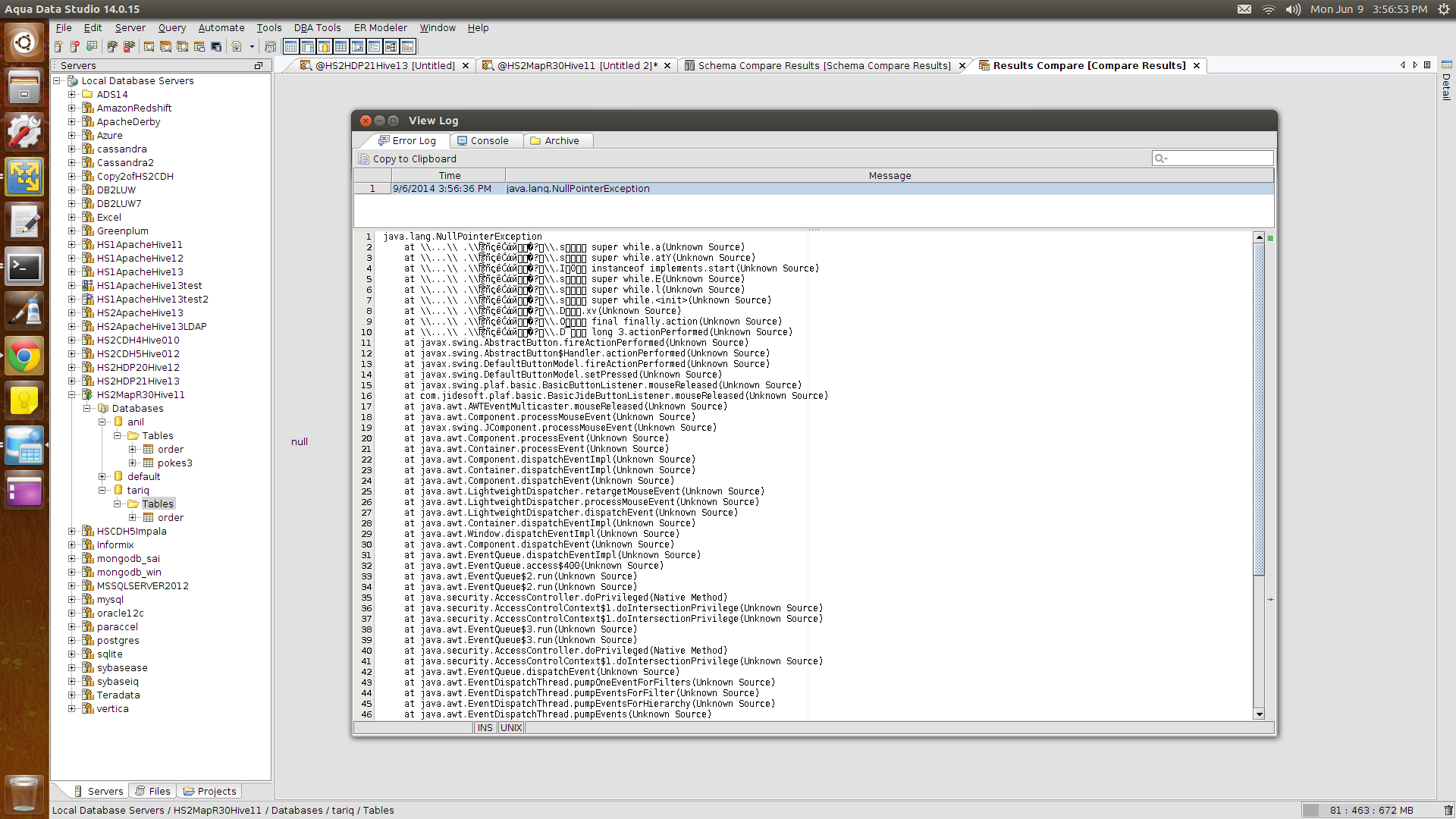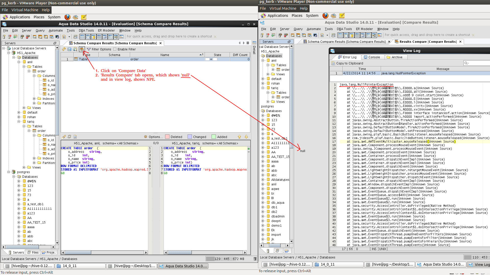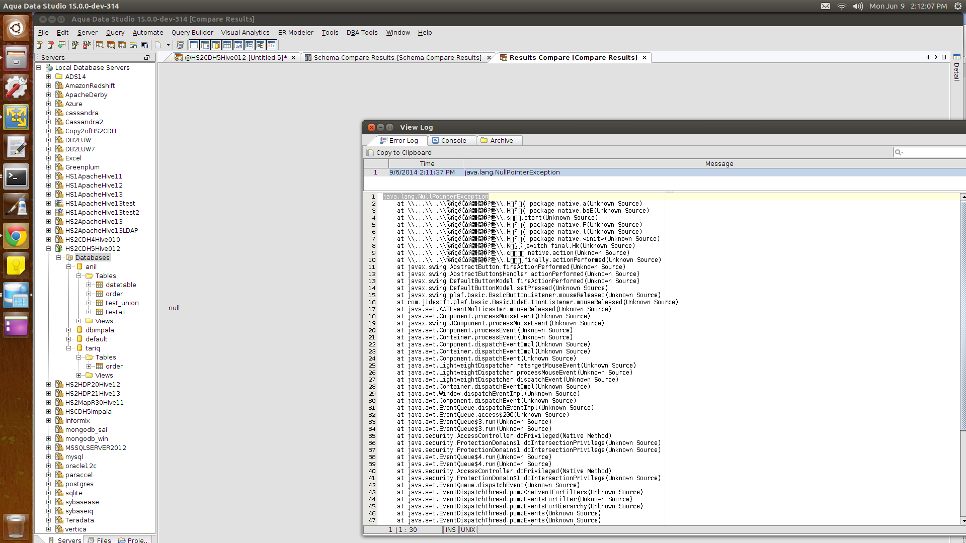 Hi Anil, I think this is a result of uncaught database exceptions. Because of these exceptions, result sets were not being created. This caused the NPE. In my case, I was getting return code 1 from org.apache.hadoop.hive.ql.exec.mr.MapRedTask when doing comparisons against Hive. The select was failing!!