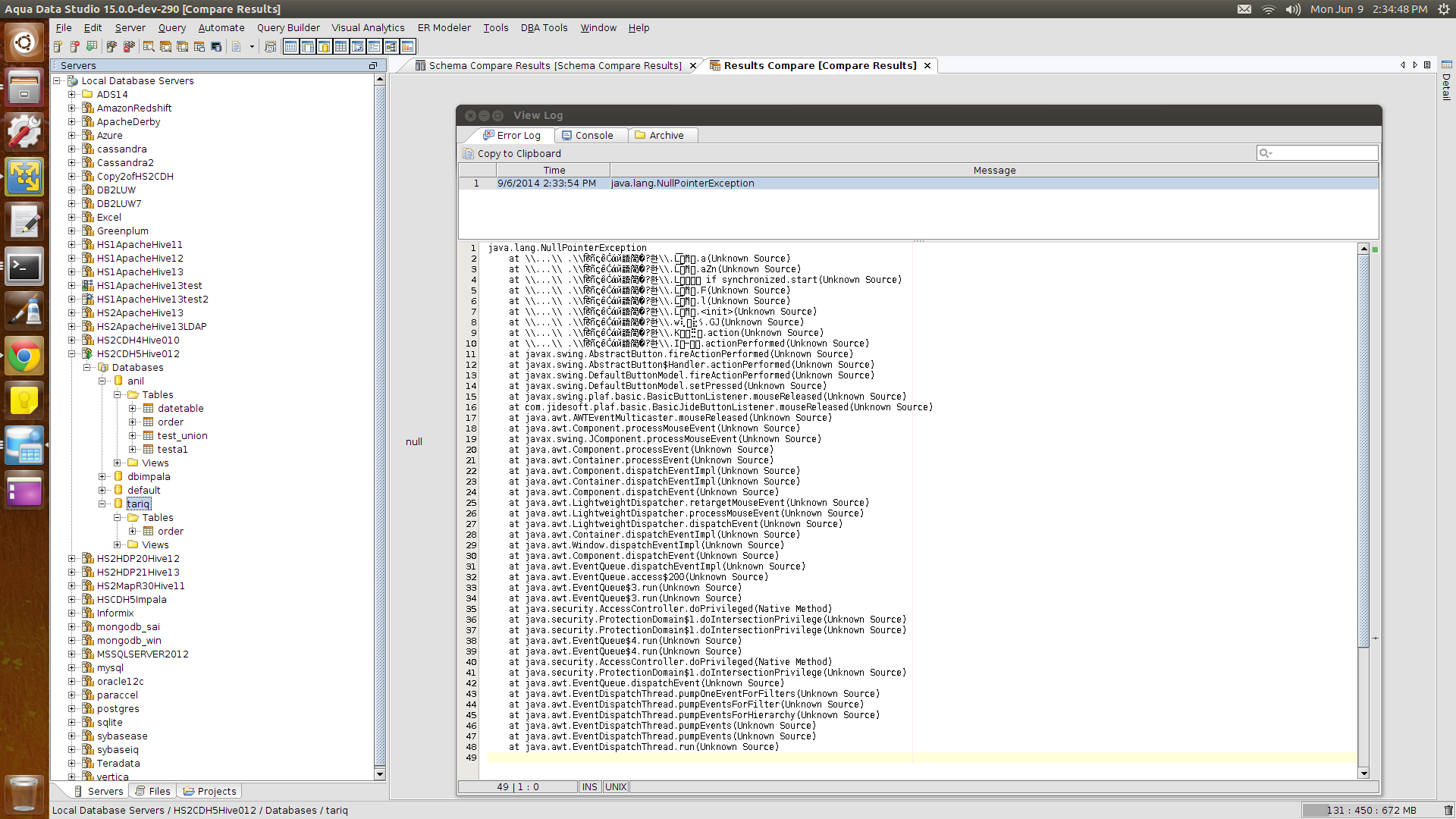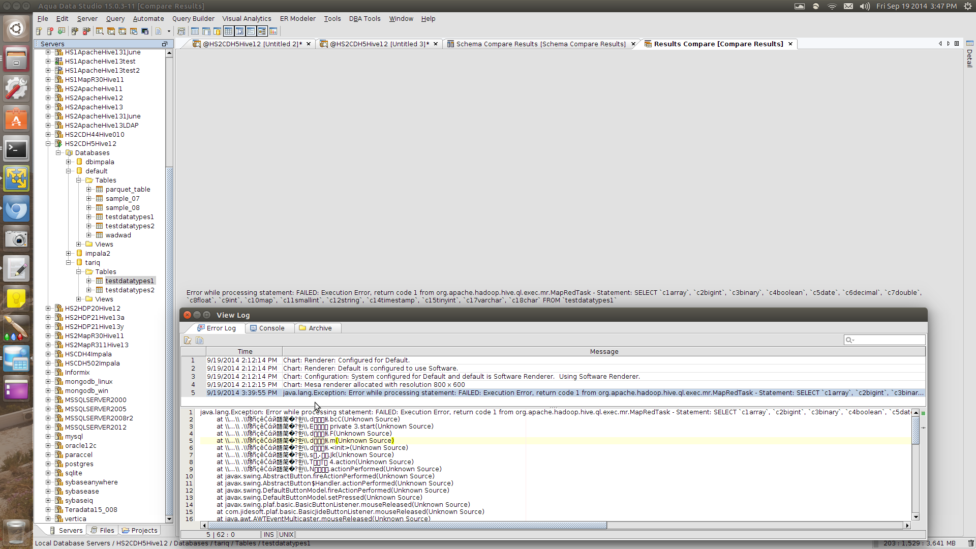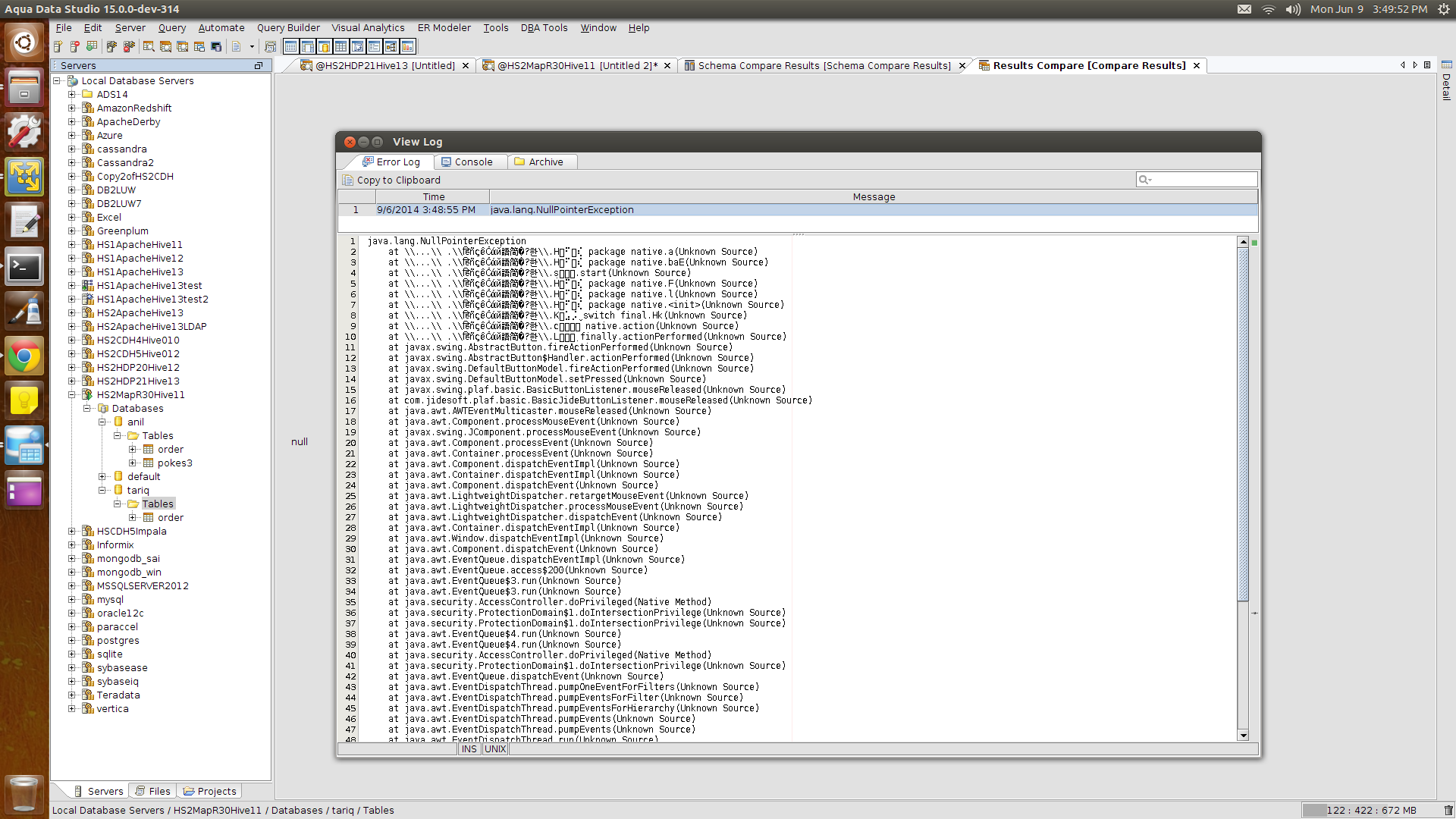 Hi Anil, I think this is a result of uncaught database exceptions. Because of these exceptions, result sets were not being created. This caused the NPE. In my case, I was getting return code 1 from org.apache.hadoop.hive.ql.exec.mr.MapRedTask when doing comparisons against Hive. The select was failing!!