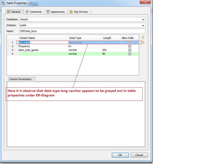 We do not have long varchar in either the Create Table visual editor or Create Table in the ER Modeler. The grayed out is as designed for this scenarios. I will look into if we need to add long varchar.