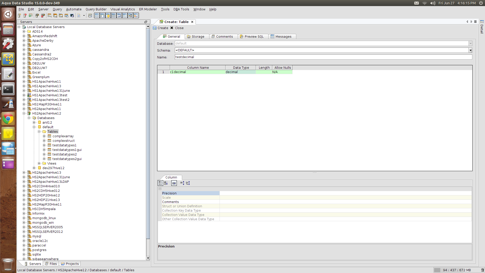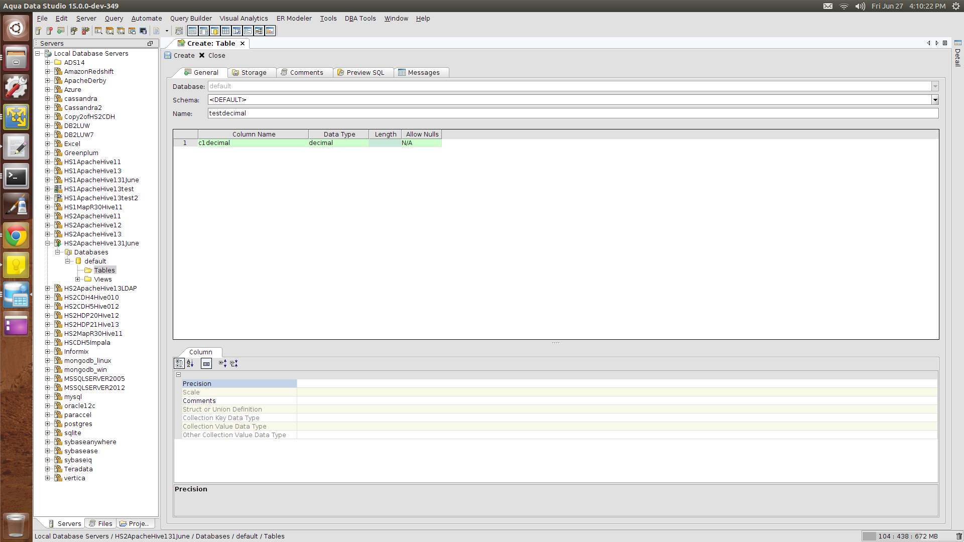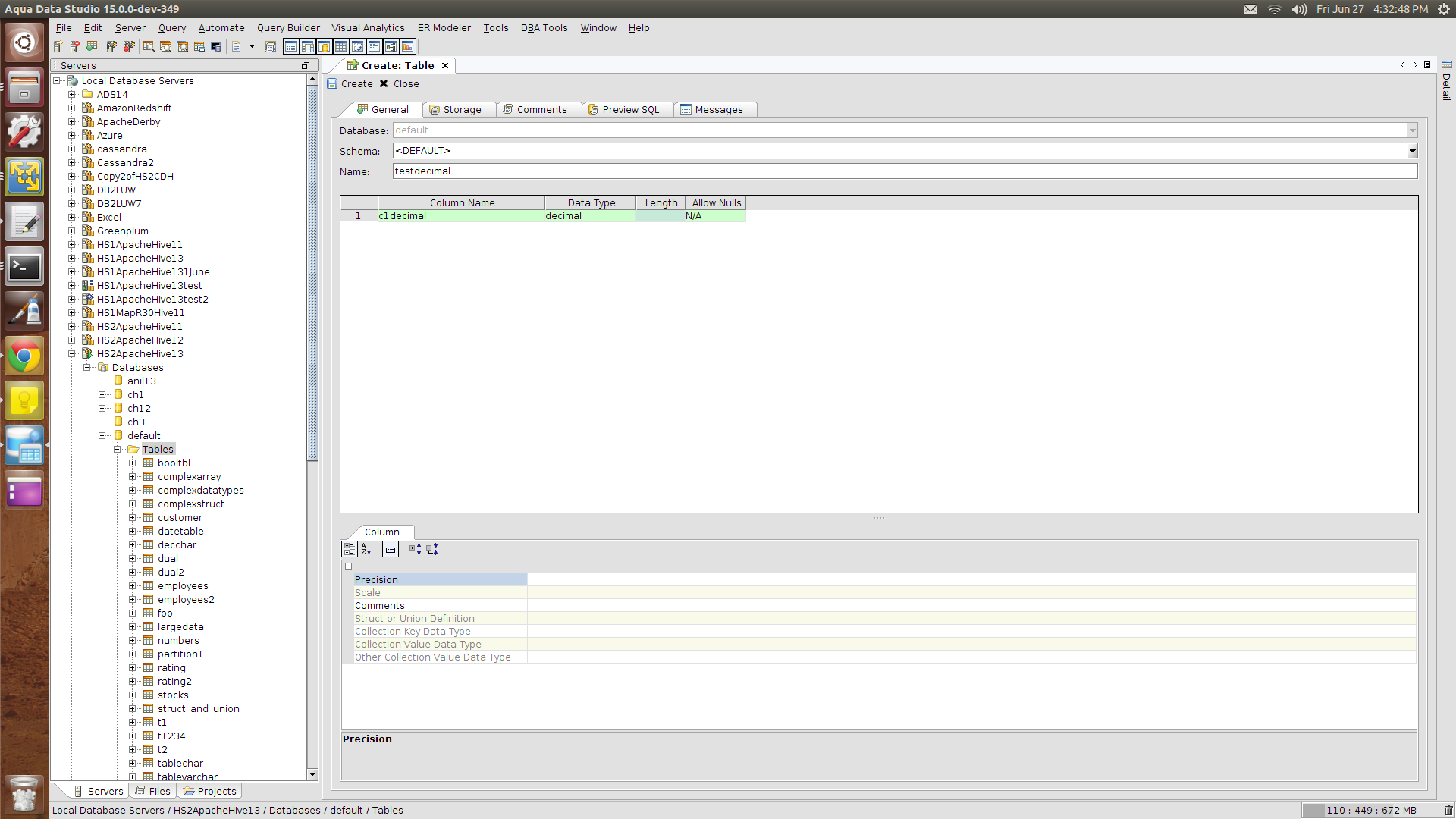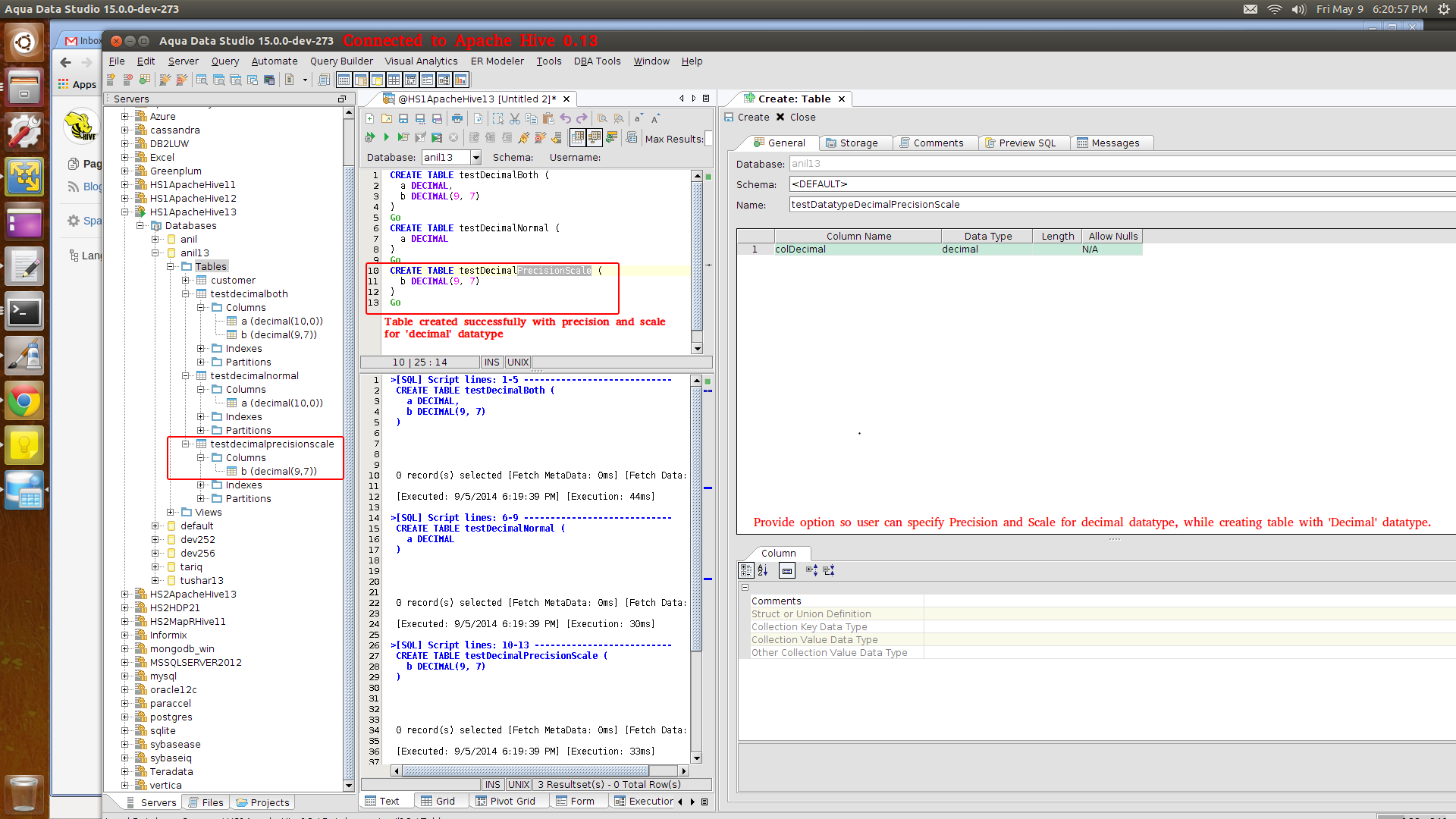 Issue: Add support for Decimal datatype scale and precision when creating tables, by ADS visual editor - for ApacheHive0.13 -