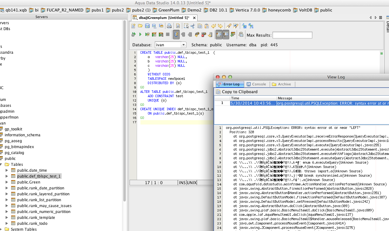Go to ivan database and Script Create Full the tables public.def_tblspc_test_1 and you get below exception.