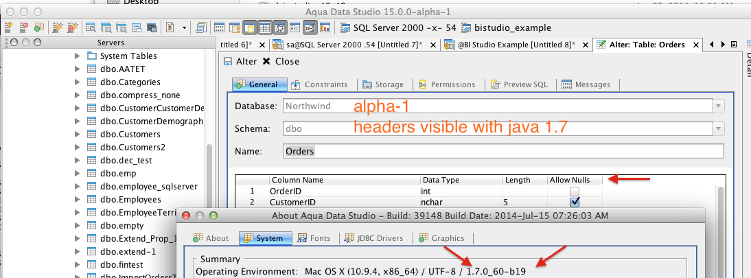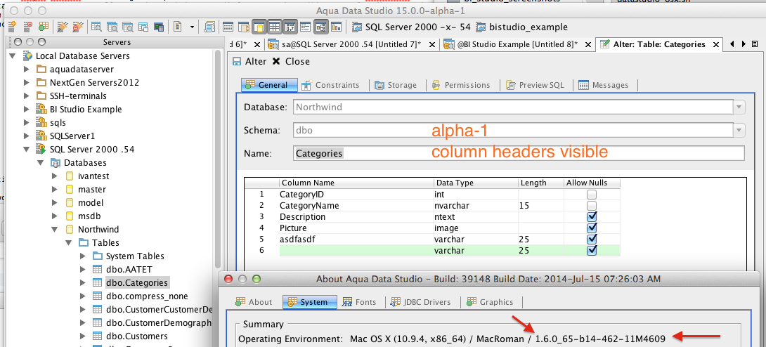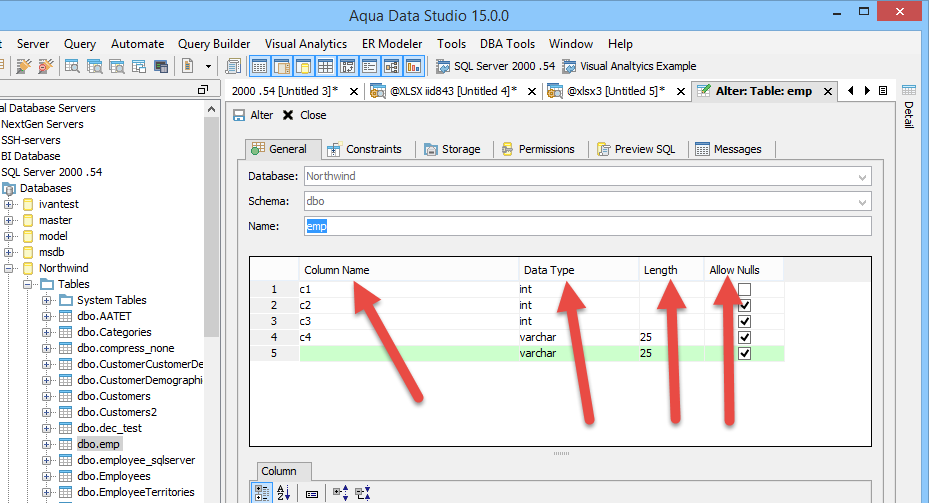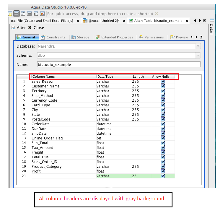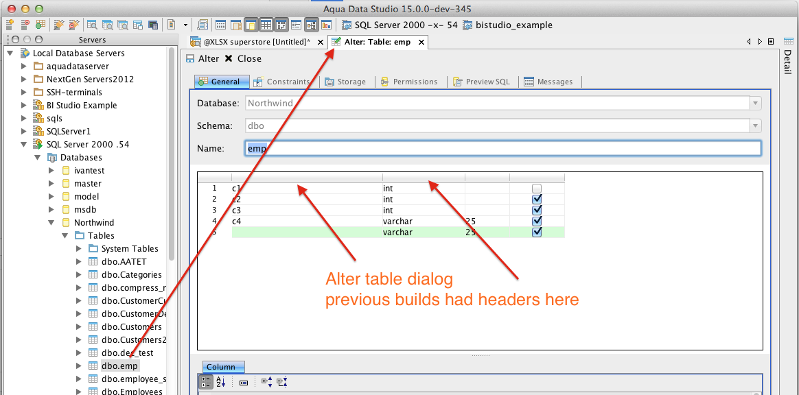 5. the GUI for visual editing > Alter lists the columns and their datatypes in a grid, but the grid headers are not at the top of the grid.