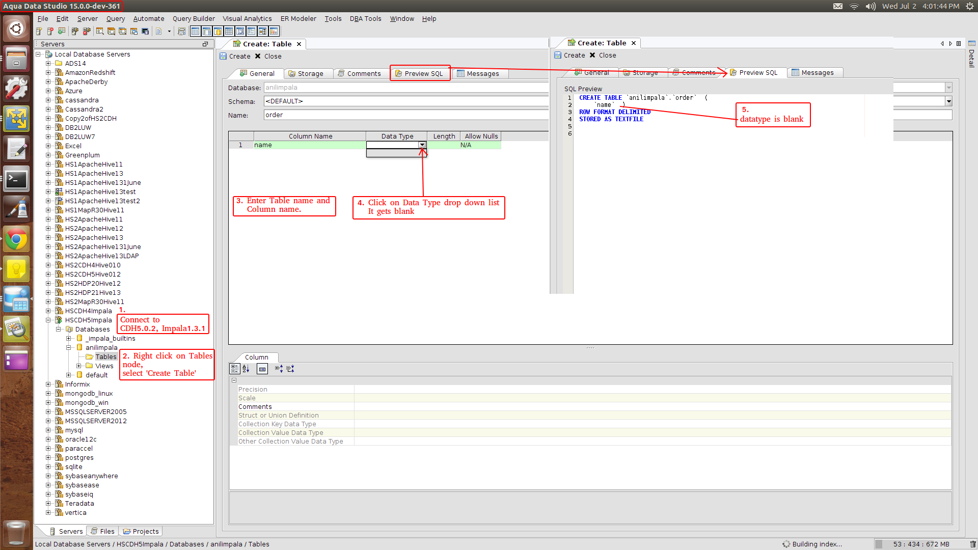 Issue: Impala- ADS Visual Editor, Create Table column datatype list gets blank