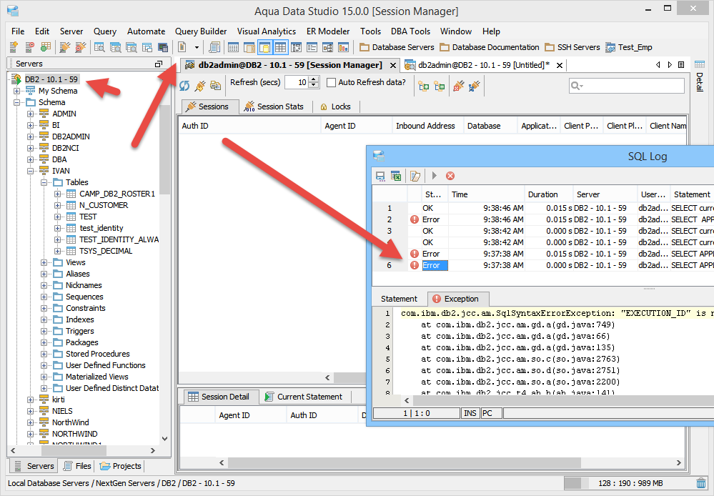 When attempting to view sessions via the DB2 DBA Tools > Session Manager for DB2 10.1 on 10.168.11.59