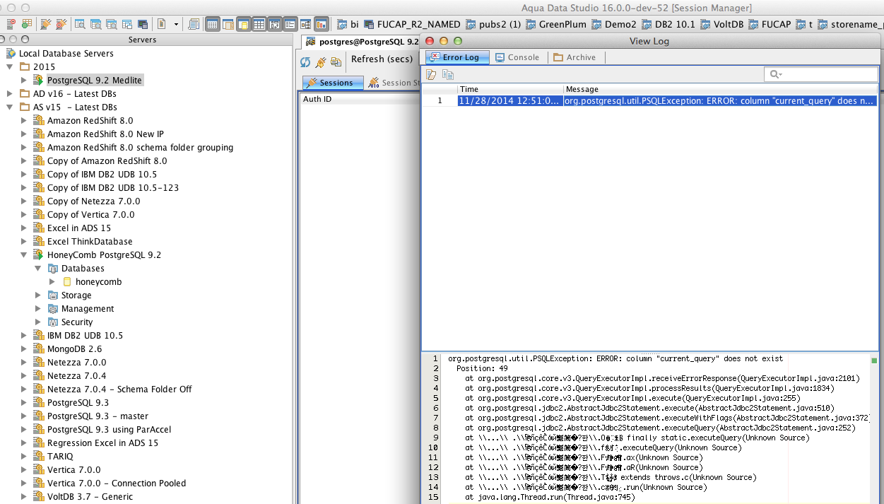 PostgreSQL DBA Tool -> Session Manager gives column current_query not found exception