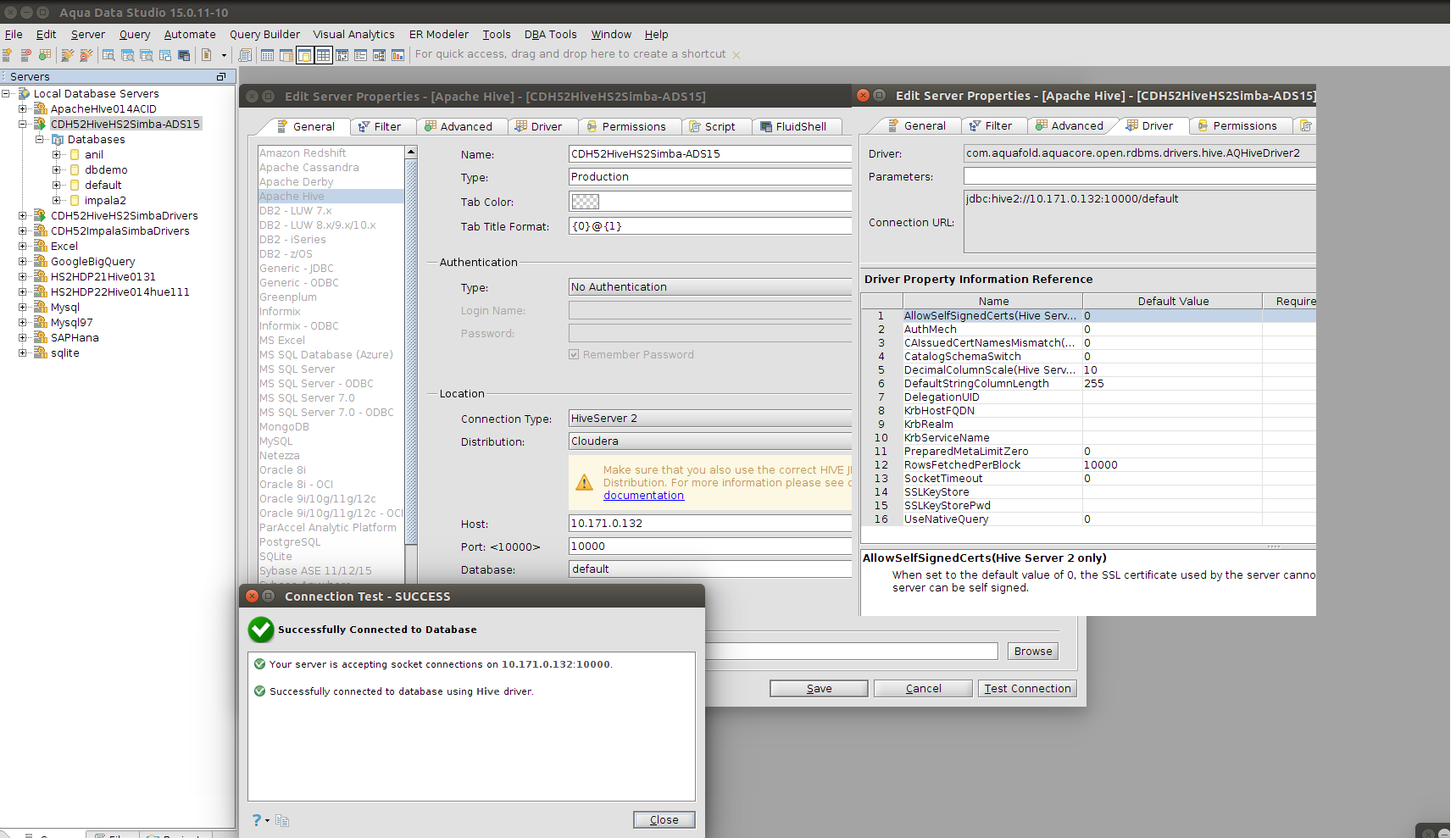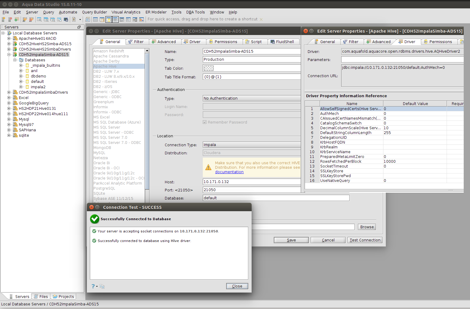 ADS15 successfully connected to Cloudera Hive and Cloudera Impala.