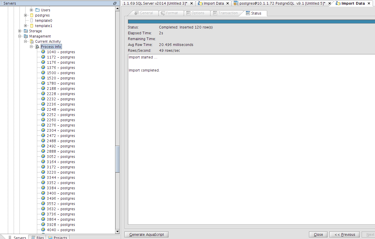 Import a CSV file into a PostgreSQL database, then in the schema browser list the sessions and you will see a bunch of new sessions.