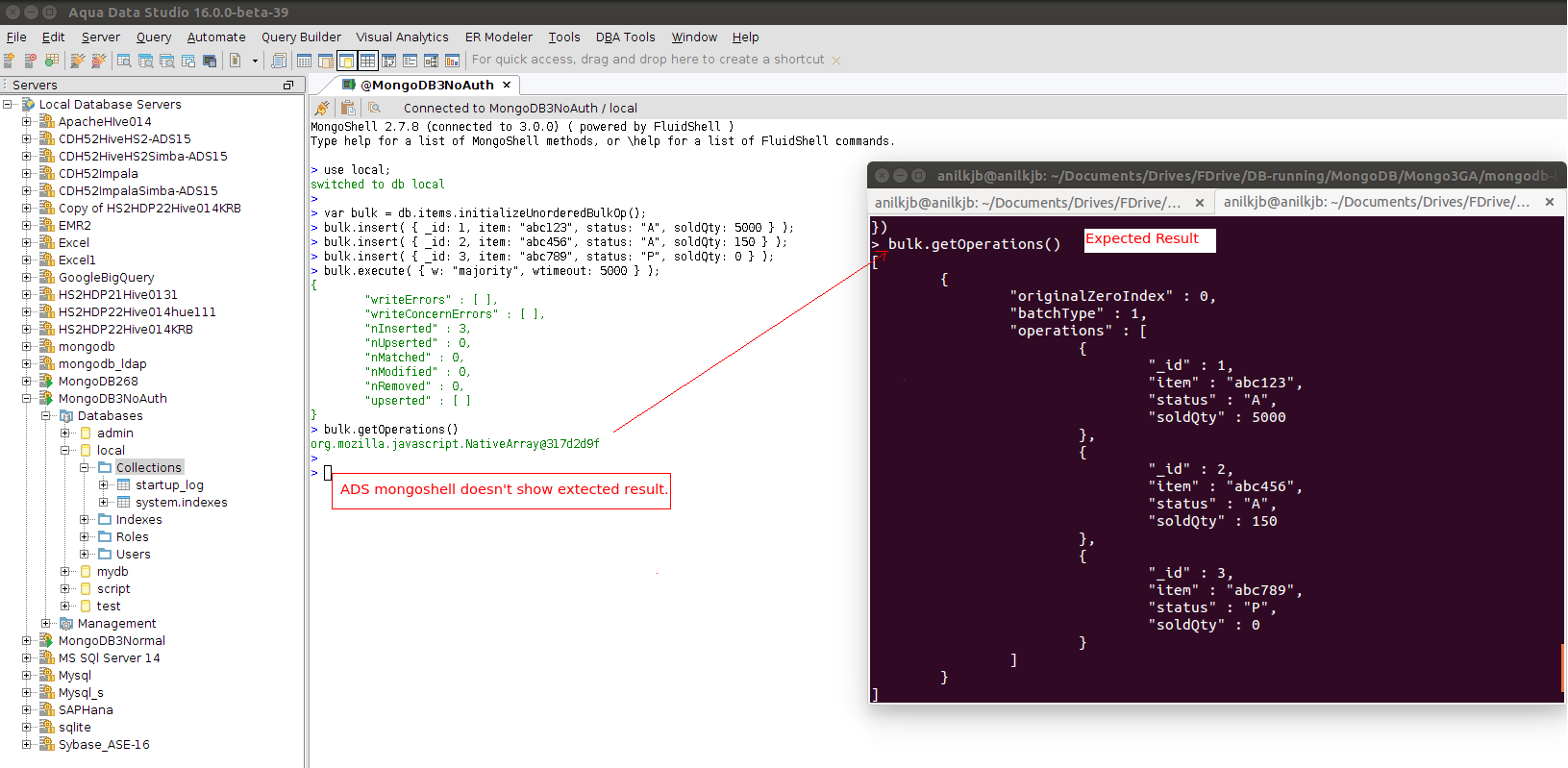 Issue: bulk.getOperations() command doesn't show result in ADS MongoShell
