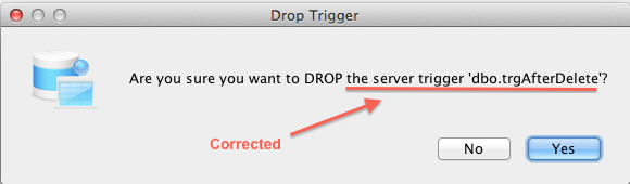 message will now read: Are you sure you want to DROP the server trigger '<schema>.<trigger>'?