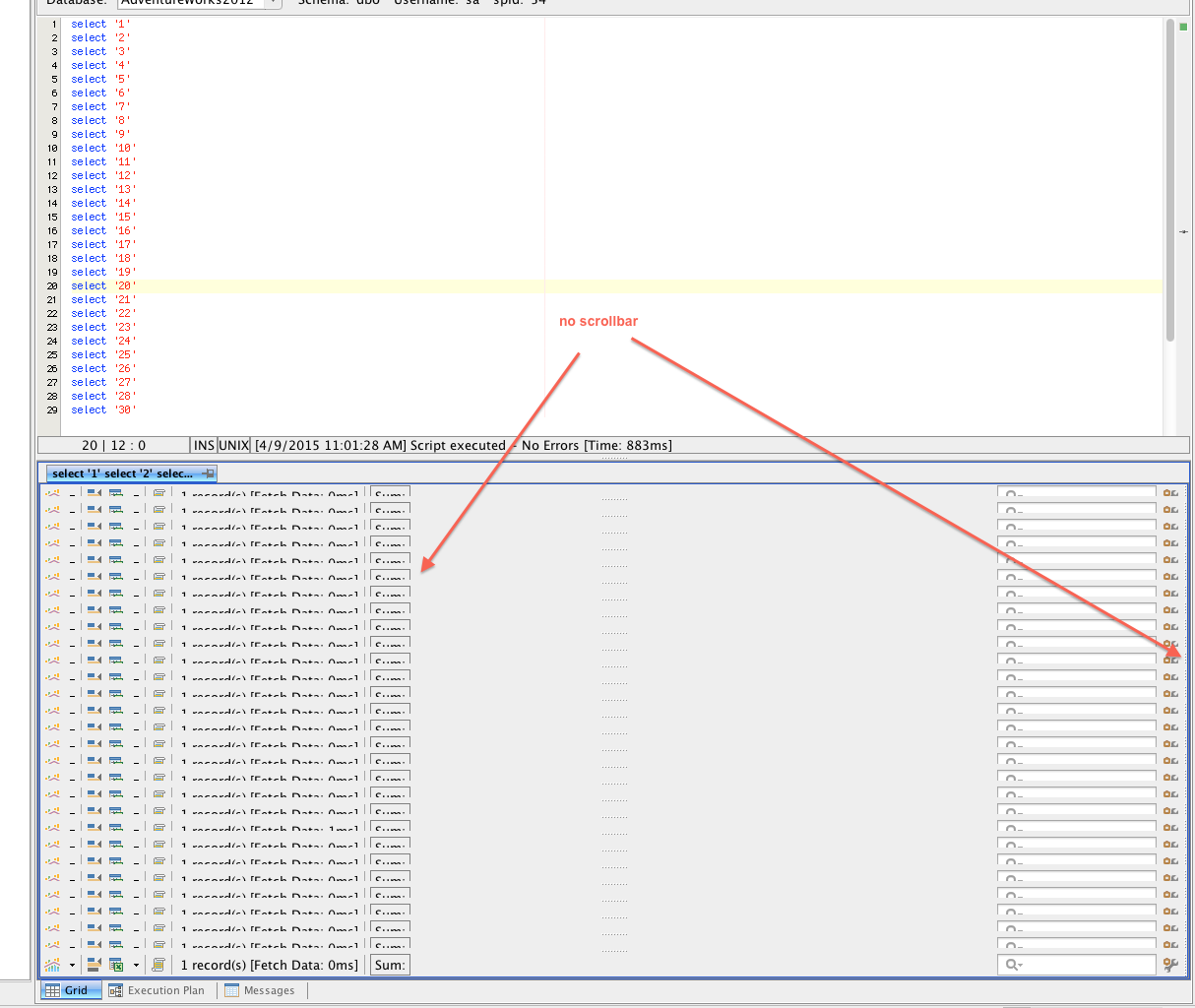 If Query Result Pinning is enabled, and Sql has multistatement, every single grid is shown in the grid results window, but since v16.0 all grids are attached to fit in a single window, "without vertical scroll". If there is many grids, this make impossible to read all result rows.