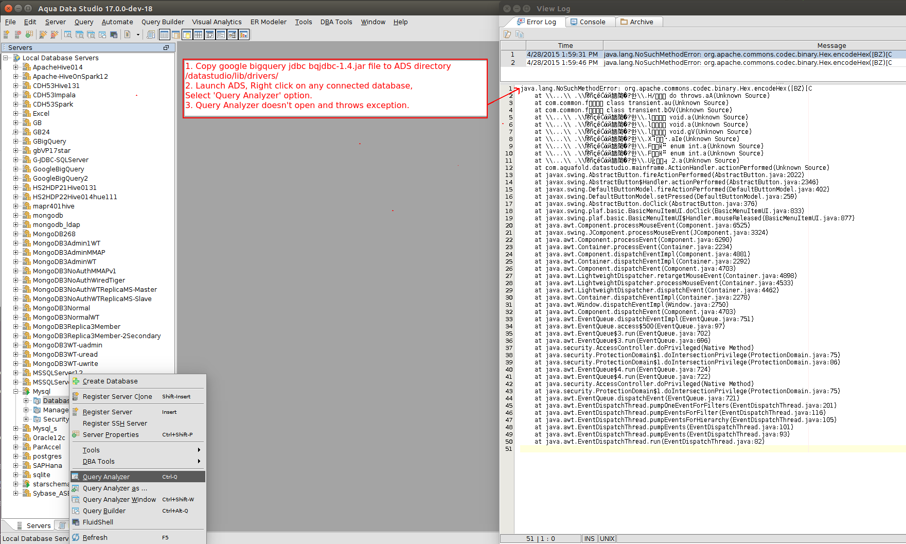 >> Tried with and without the "bqjdbc-1.4-standalone.jar" file, still it shows exception for latest build[ADS 17.0.0-dev-18]. The exception is not observed for previous build- ADS 17.0.0-dev-15.
