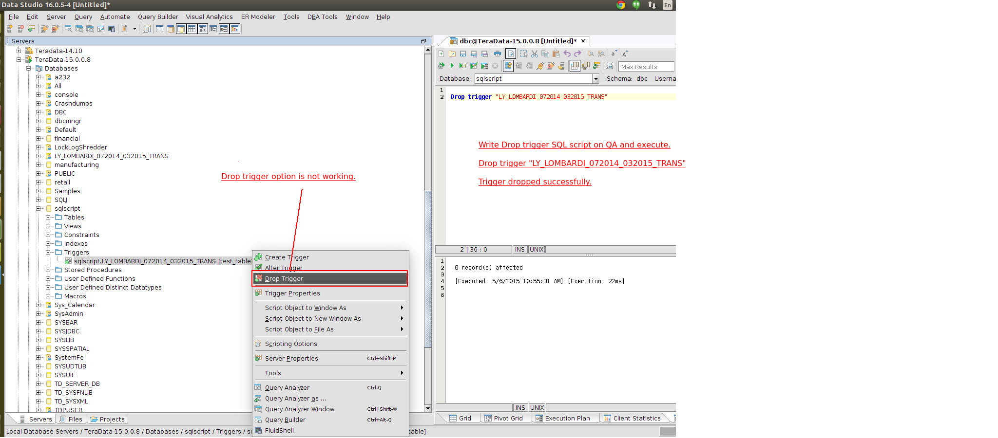 ->I am not getting any error message on Drop trigger option