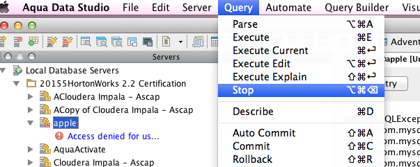 This happens if you try to open a Query Window which fails as in the indicated screenshot, and then the user chooses the application menu item Query->[Server -> Stop]