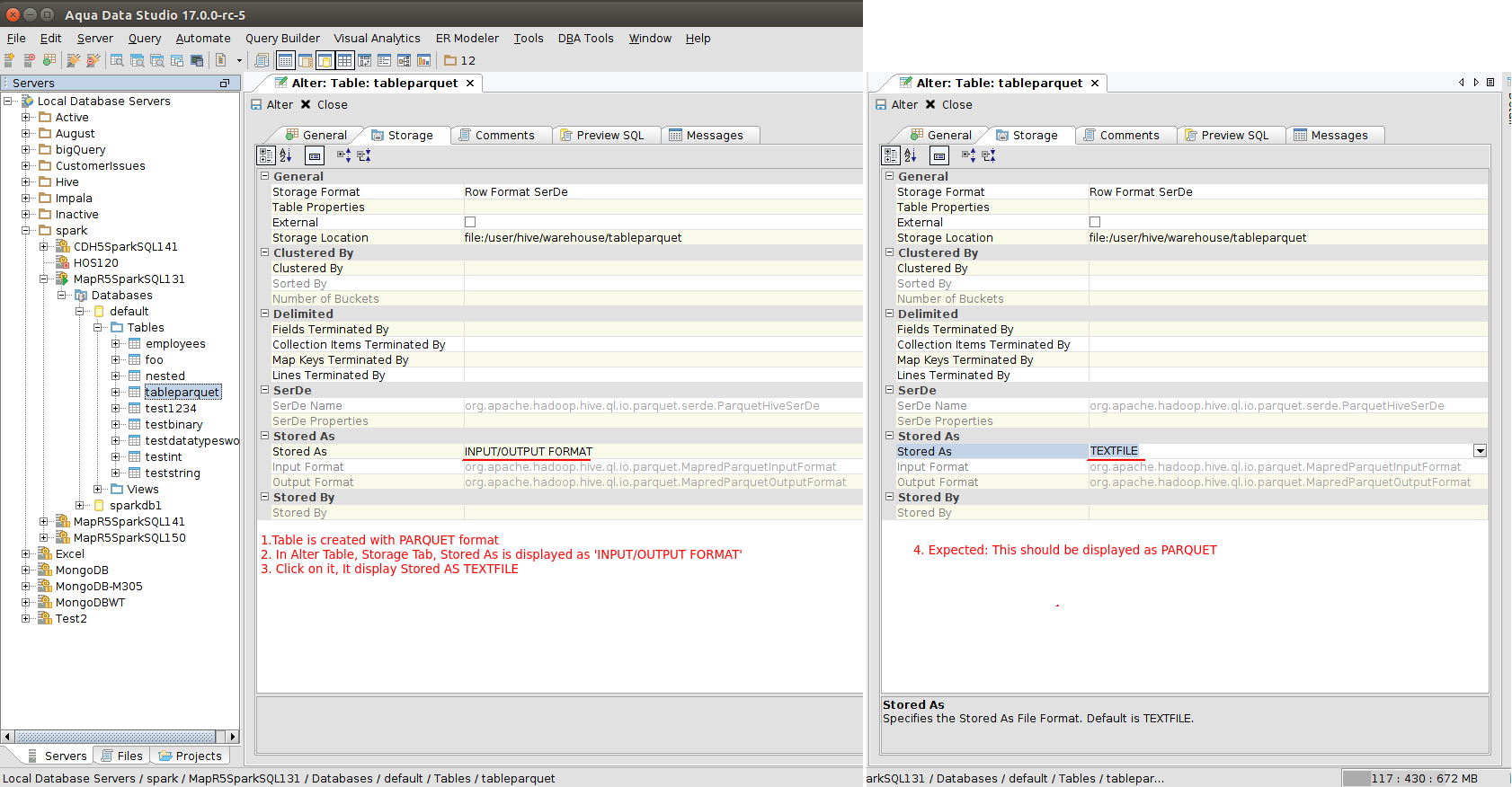 Hi Anil, Text file is the default for the option list so it will always start with text file. When you display text file there is a list of all the different storage options. From that list, you can select which storage option that you want to alter the table with. It would be nice to have the list start off at parquet, as in this example, but there is nothing in that part of the code where I can get the original storage type. I don't think we should attempt to fix this since it really isn't broken. Thanks, Tom