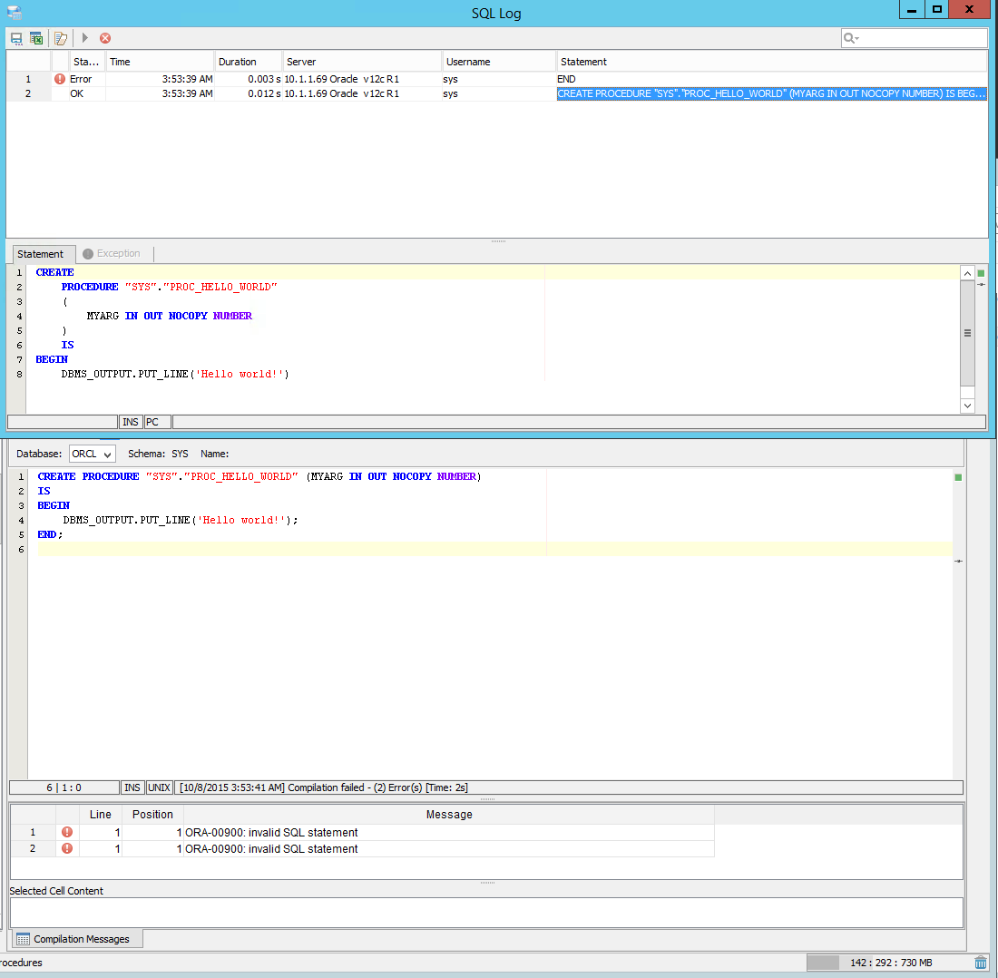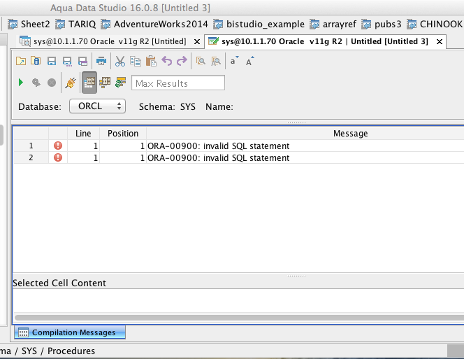 When compiling an Oracle stored procedure using the Aquadata procedure editor compilations fails with two error rows. Both are ORA-00900: invalid SQL statement.