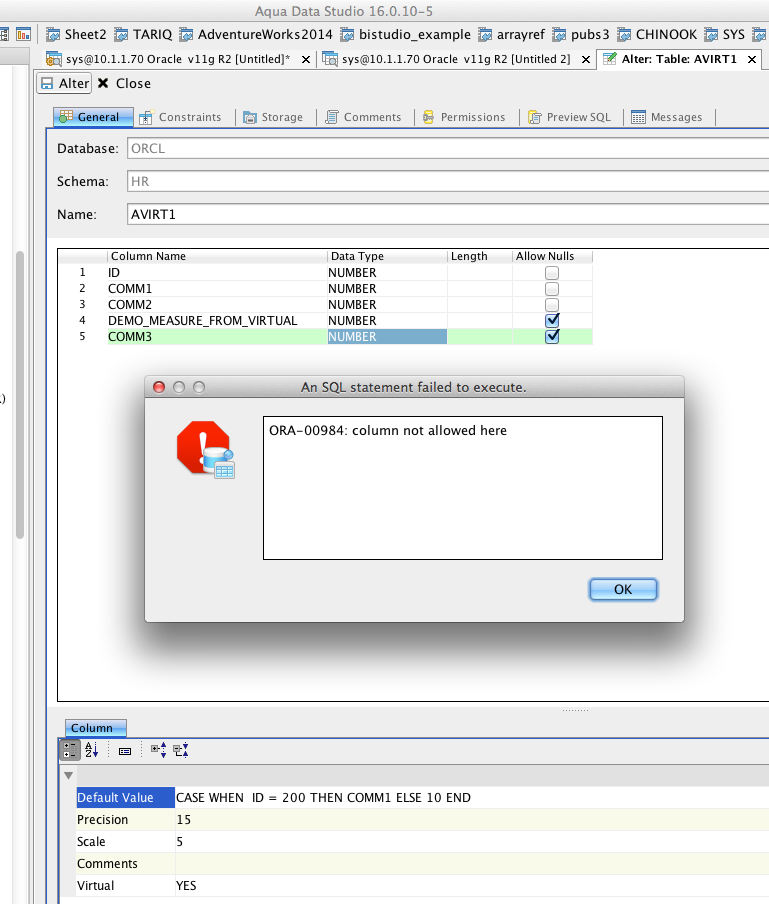 Virtual column property added to create/alter table GUIs. The virtual column details are held in the default value of the column. Once a column is created it may not be altered to/from a virtual column. The virtual column details default value are allowed to be modified for the virtual columns expression.