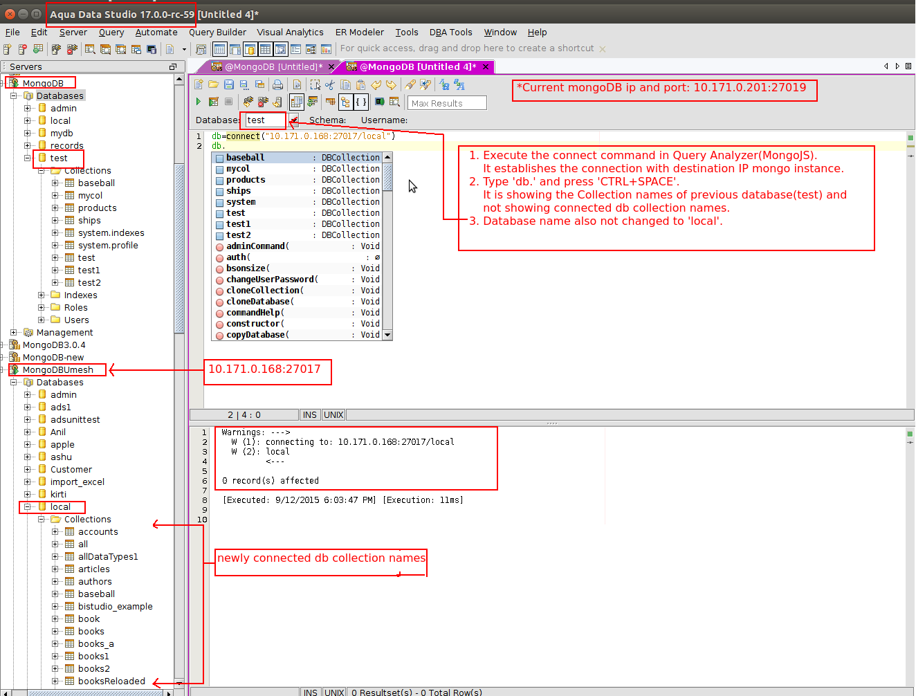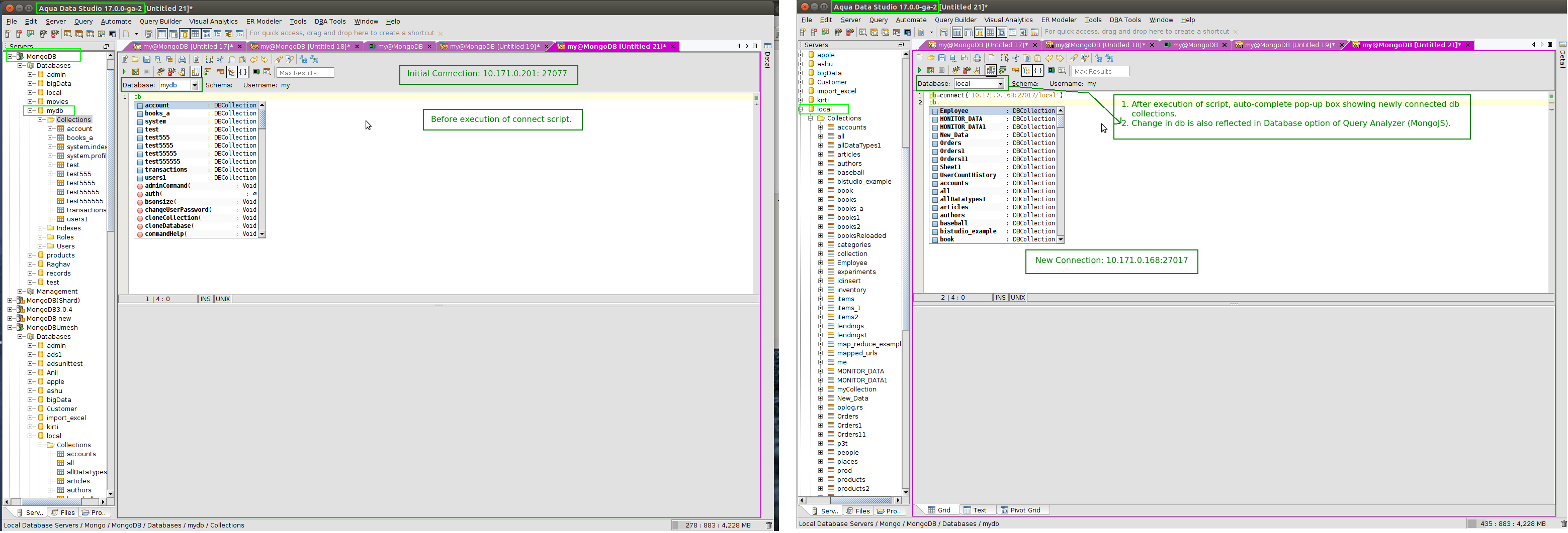 - ADS code has been updated to check if the server context has changed after executing script in MongoJS or MongoSQL Query Analyzer. If the server context has changed, it'll refresh the Database drop-down list and the MongoJS auto-complete configurator.