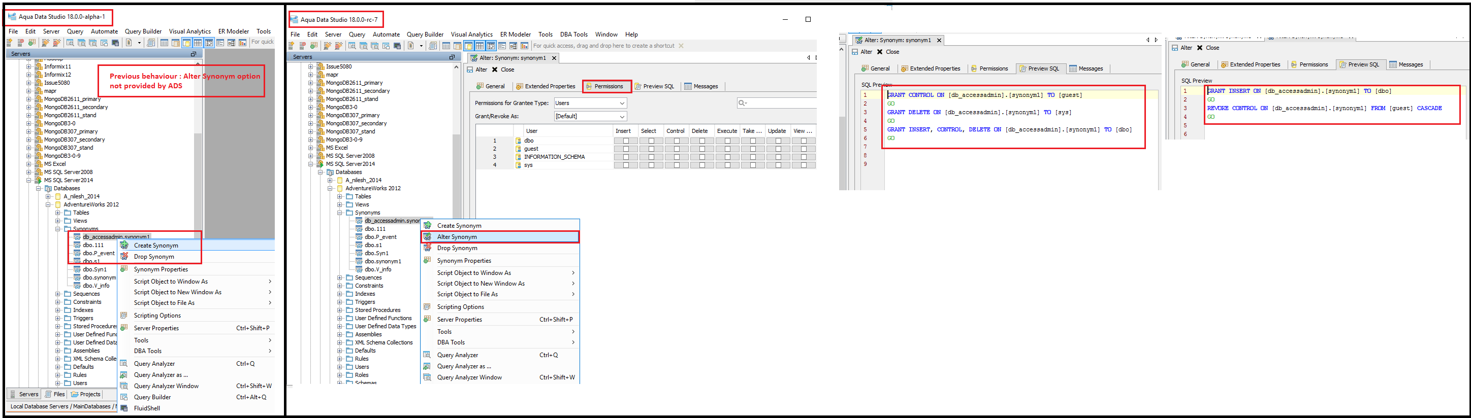 Extract/Script/GUI support has been added for permissions information to sql server synonyms. In the synonym tree node you will now have script GRANT/REVOKE action options & ALTER action option. The GUI does not allow for any of the synonym General tab properties to be changed, but does have the extended properties tab and the permissions tab that allow for modifications.