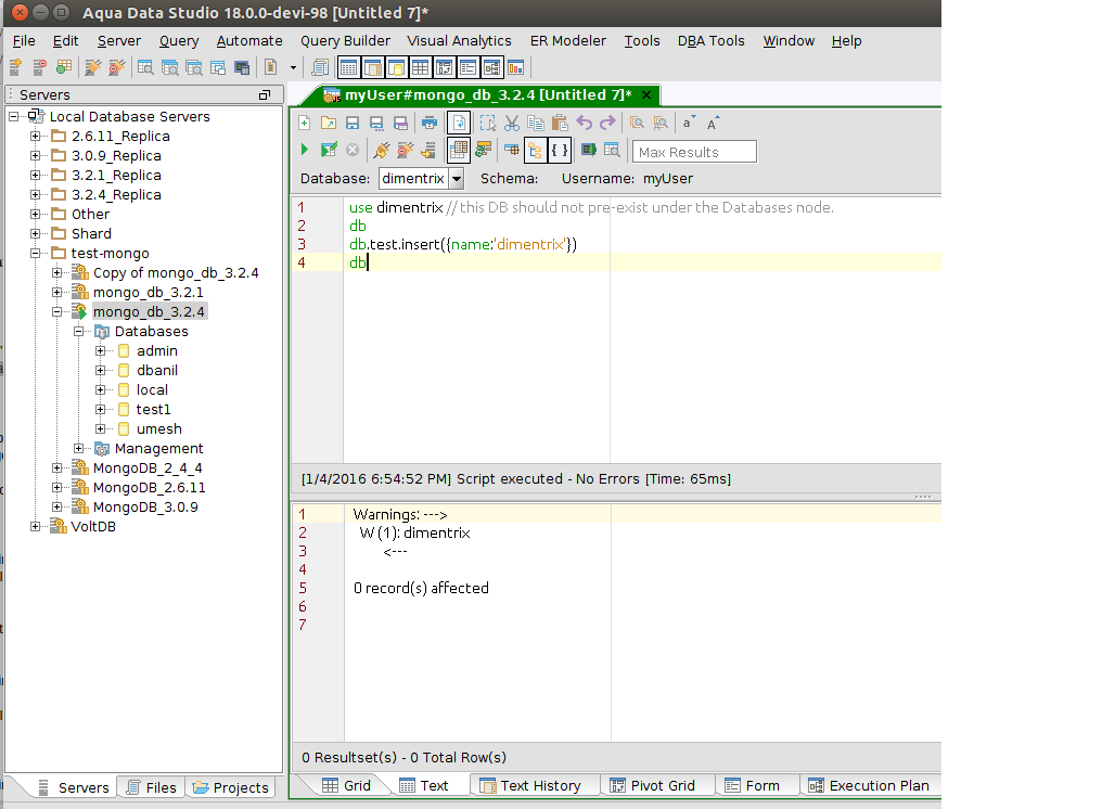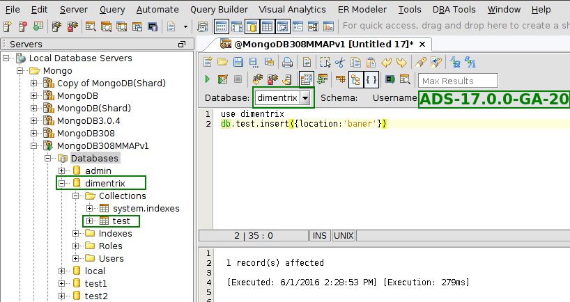 The behavior of MongoSQL Query Analyzer is that if you execute a USE command with a database that doesn't exist, MongoSQL will return an error message "There is no database named 'dimentrix' on the server namespace."