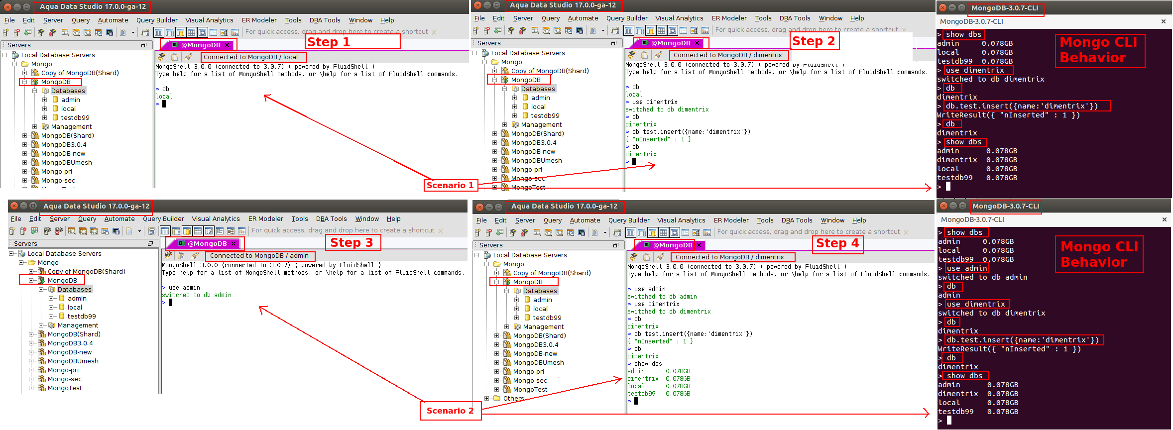 In MongoCLI and MongoShell, there are no drop downs for Database. But when we switched to new database, their status bar reflects the same.