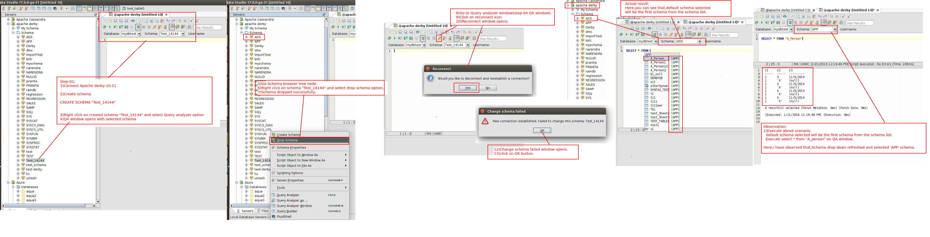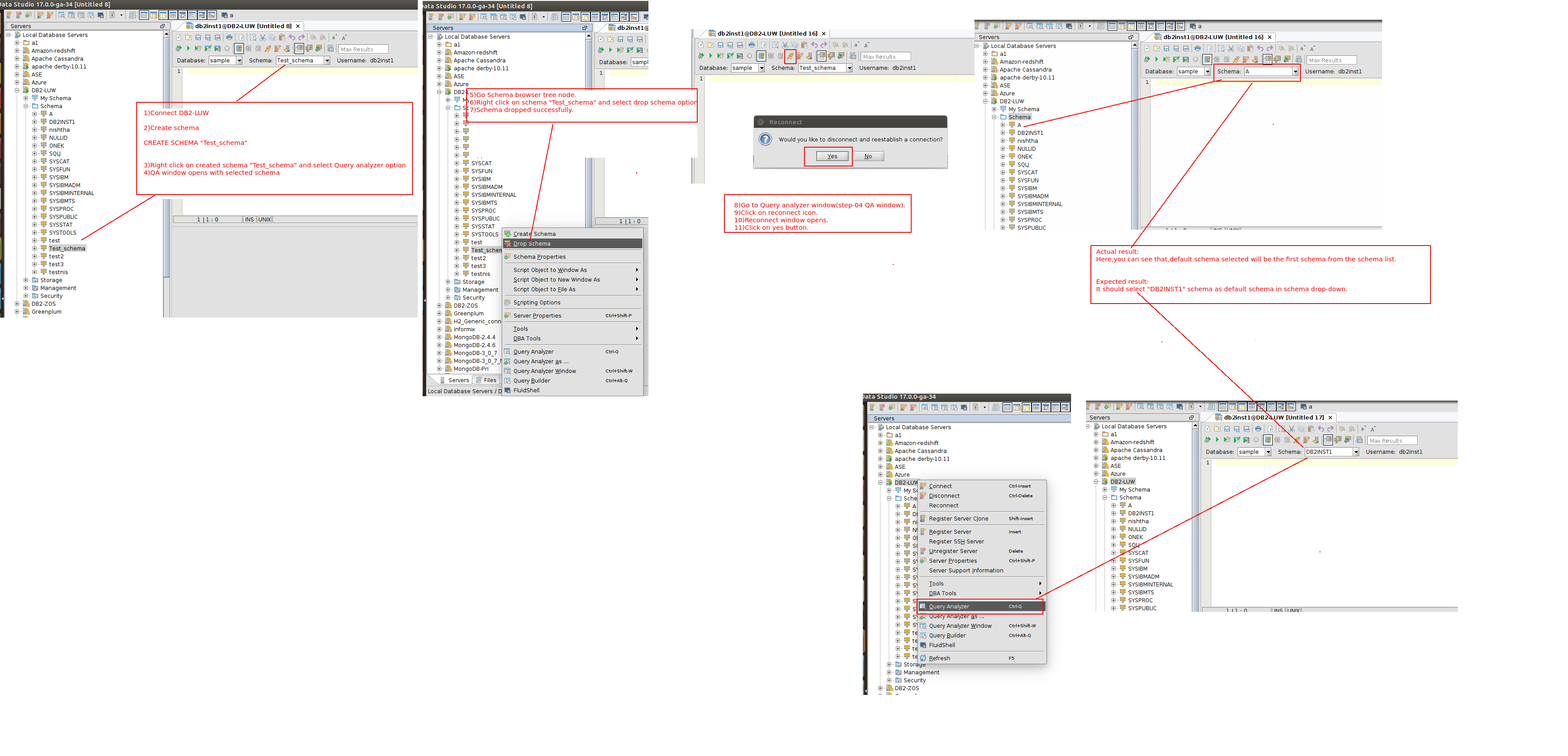 During Reconnect, we issue SET CURRENT_SCHEMA = "Test_schema". DB2-LUW doesn't return an error even though the schema no longer exists. (Check the SQL Log; the SET CURRENT_SCHEMA command is successful.)