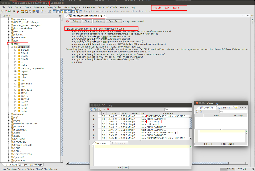 I executed the above scenario-1 for MapR 4.1.0-Impala. After clicking on 'reconnect' button, it shows Error Message. "Error in getting HiveConnection."