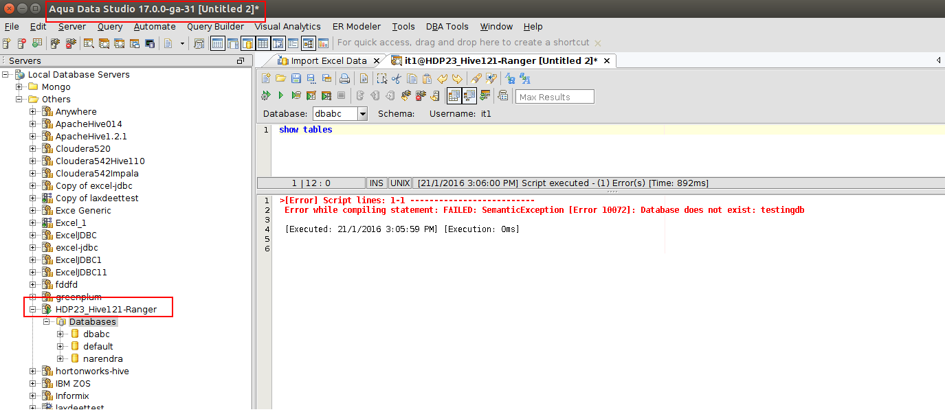 I have executed the above scenario for db Hortonworks 2.3 Hive 1.2.1. It is observed that, after reconnecting the server, database drop down shows first db name but when executing show tables command, it displays the error message "Database does not exist: testingdb". Please refer:( Hortonworks.png)