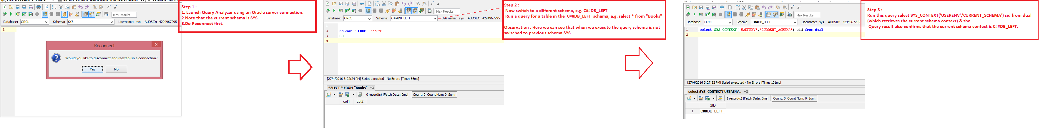 5-b. Run this query select SYS_CONTEXT('USERENV','CURRENT_SCHEMA') sid from dual (which retrieves the current schema context)