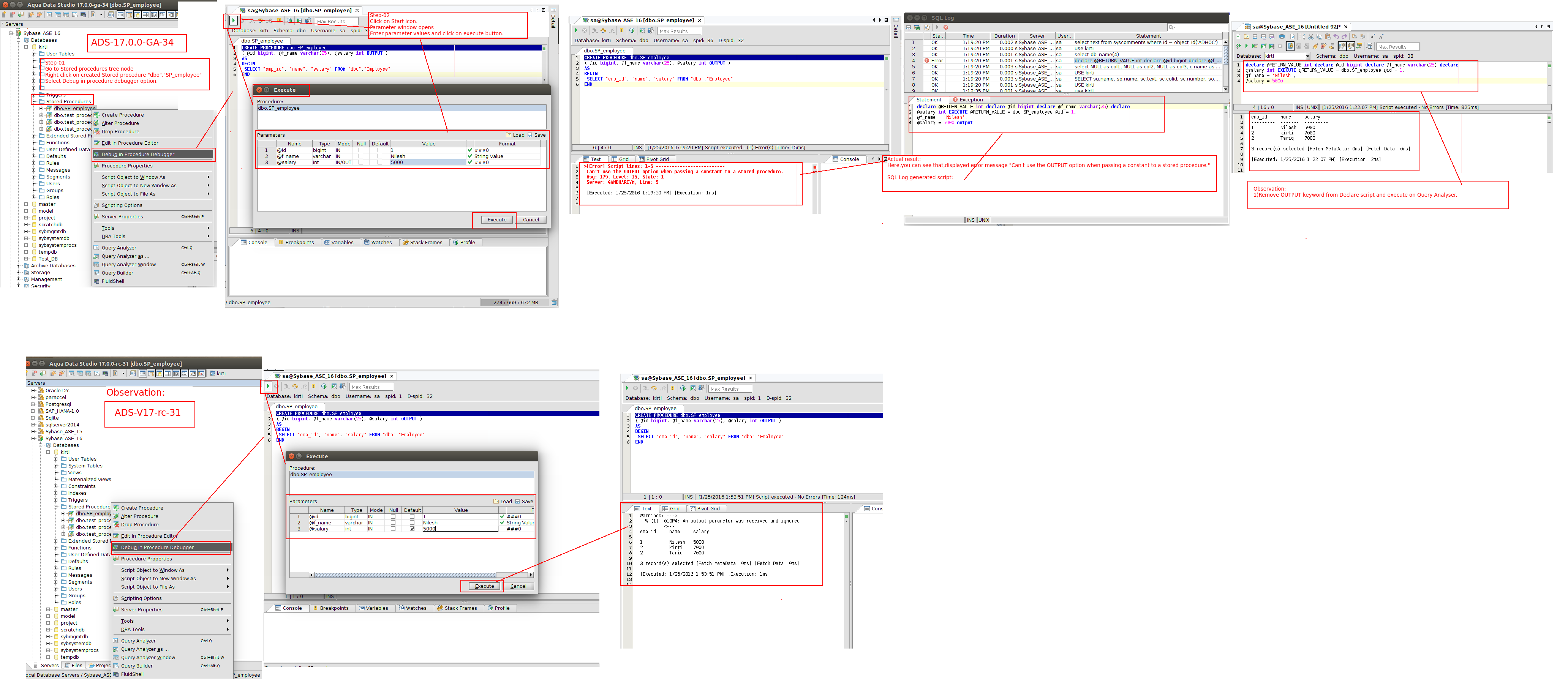 Script debugger create has been modified so that if there is an output parameter, the variables will be set before sent in the execute statement and not set inside the execute statement.
