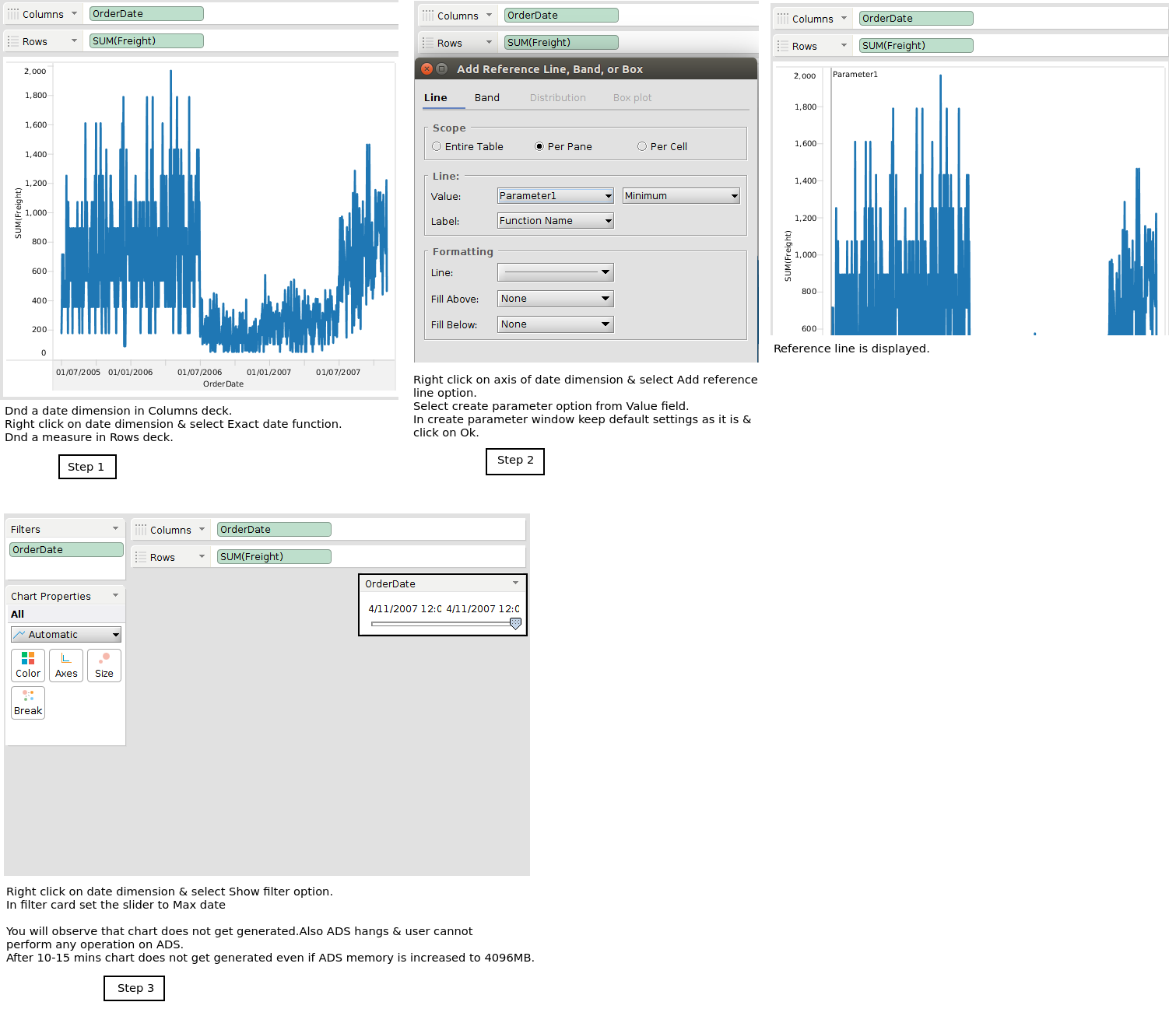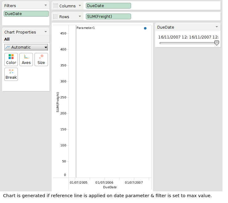 Verified in 18-dev-38.Chart is generated if reference line is applied on date parameter & filter is set to max value.