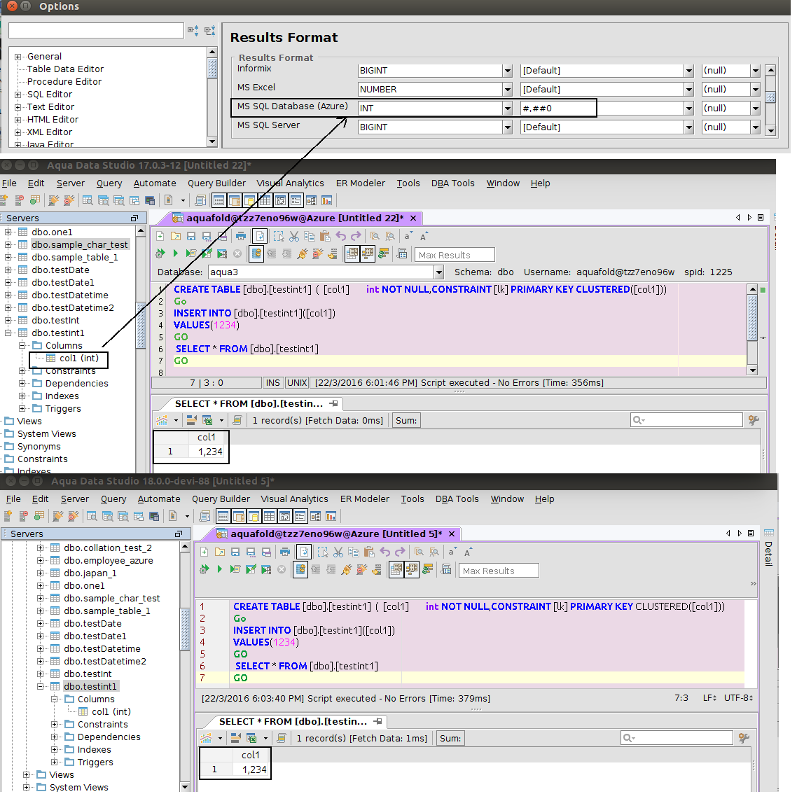 As mentioned in this issue comment, it is the File -> Options -> Results Format dialog that didn't function correctly for Azure. When you set the formats, they were not saved.