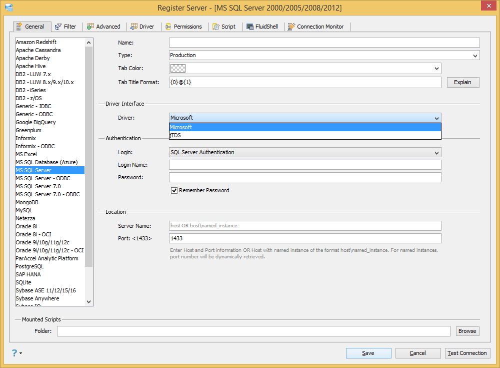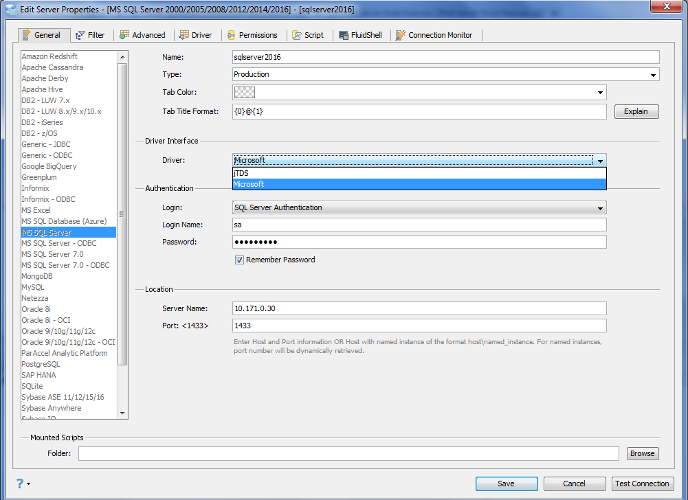 If Microsoft JDBC driver is chosen, the Authentication > Login drop down should only offer 2 options: