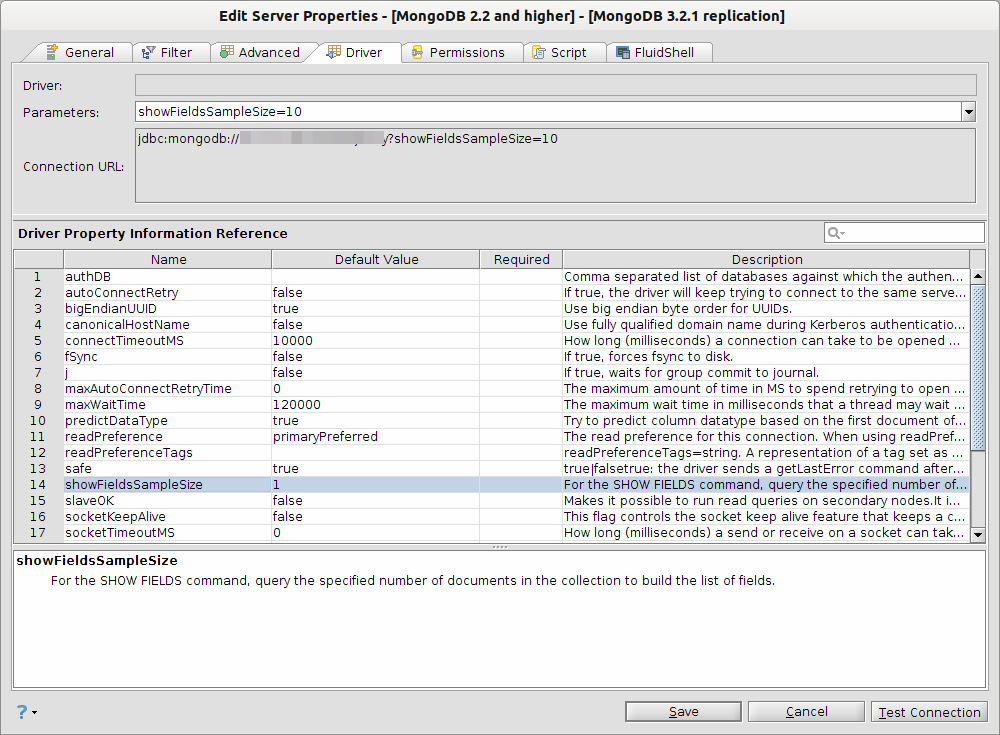 - Added a JDBC driver property named "showFieldsSampleSize". It indicates how many documents to query to build the list of fields when running the SHOW FIELDS command.